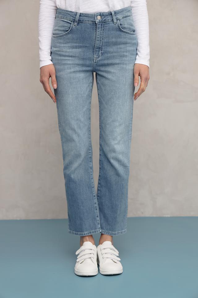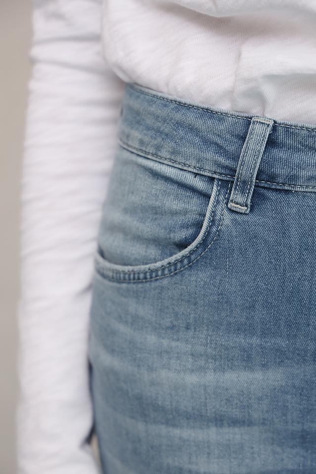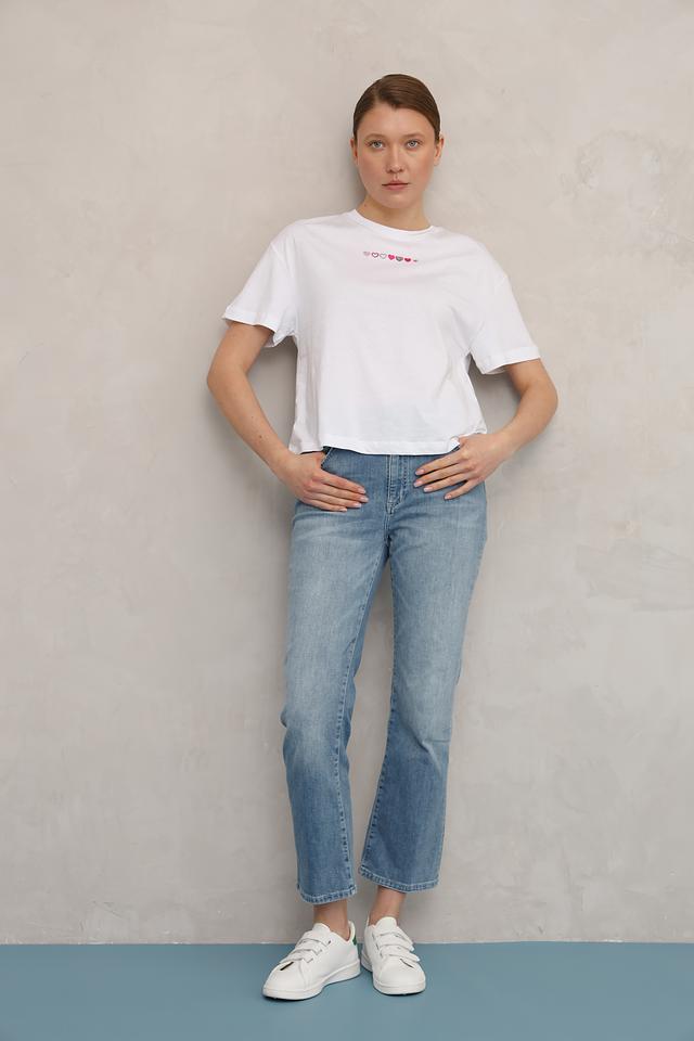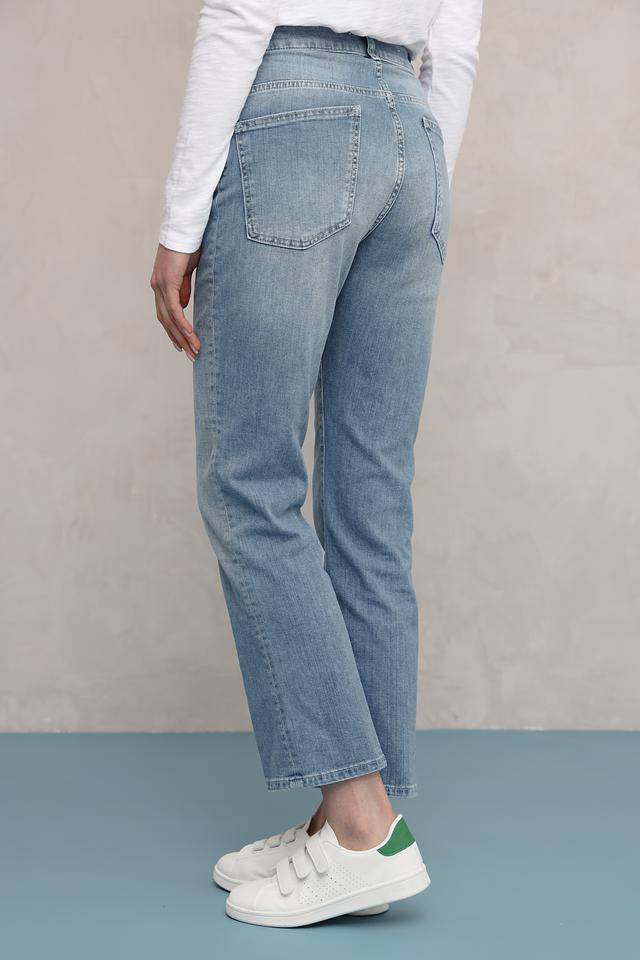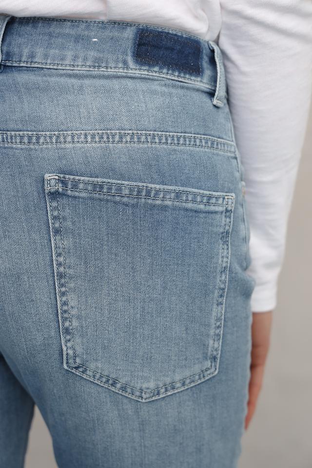 Джинсы имеют классическую посадку на талии и зауженный книзу силуэт, что делает их универсальными для создания различных образов. Небольшие потертости добавляют джинсам винтажный шарм и делают их более интересными.