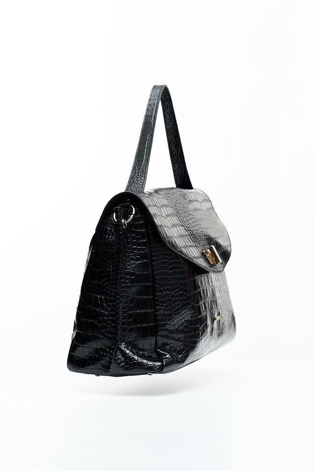 Текстура под крокодила придает сумке особый шарм и изысканность. Чёрный цвет делает её универсальной и подходящей к любому наряду. Сумка имеет удобные ручки для ношения в руке, а также съёмный плечевой ремень для комфортного использования на плече.
