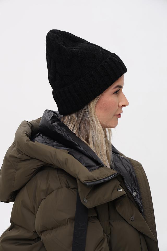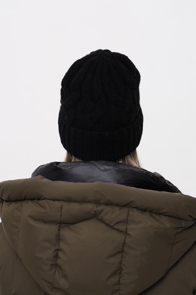 Чёрный цвет делает эту шапку универсальной и легко сочетаемой с любой одеждой. Вязаная текстура придает ей стильный и современный вид. Шапка плотно прилегает к голове, защищая от холода и ветра.