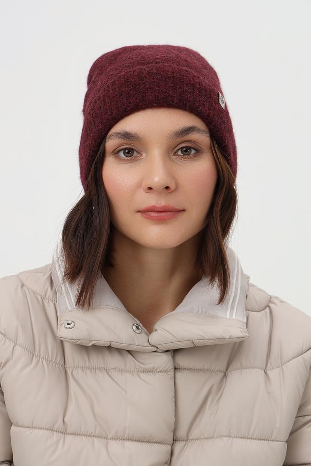 Шапка выполнена в насыщенном бордовом цвете, который легко сочетается с различными оттенками верхней одежды. Модель имеет классическую форму бини, плотно прилегающую к голове, что обеспечивает надежную защиту от ветра и холода.