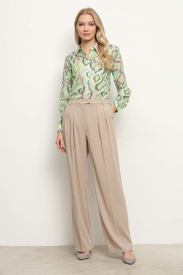 Рубашка имеет классический крой с длинными рукавами и отложным воротником. Её отличает уникальный принт, выполненный в ретро-стиле, сочетающий в себе оттенки зеленого, серого и розового.