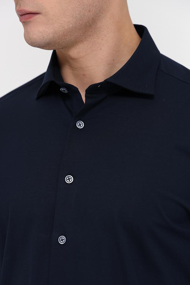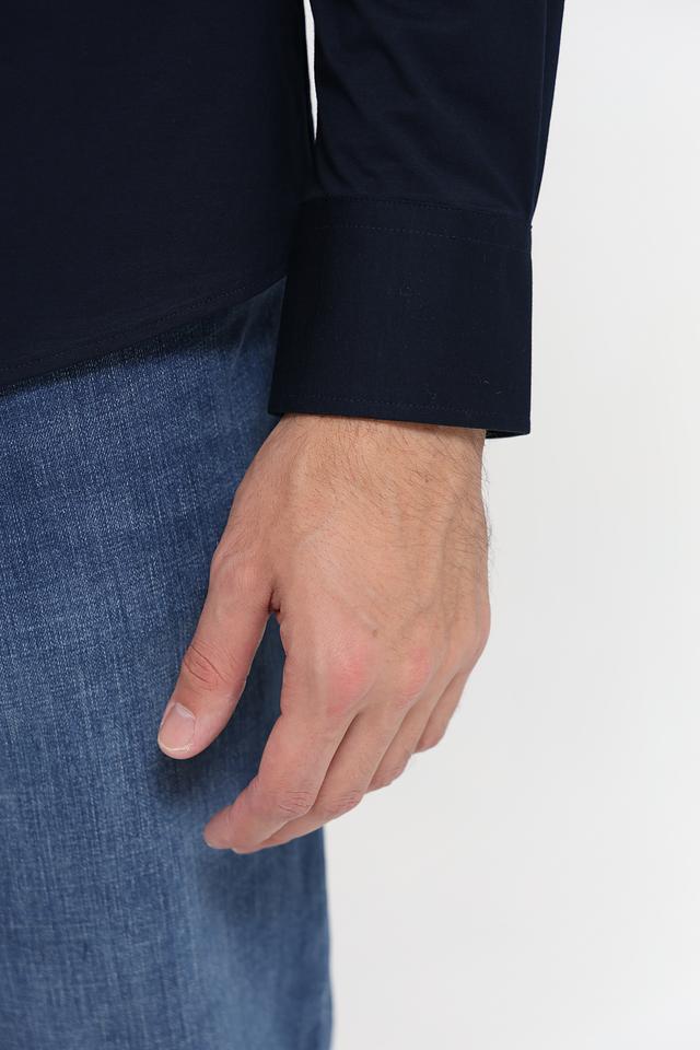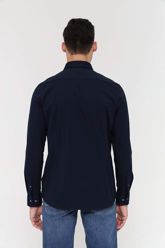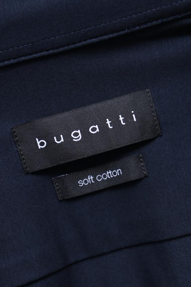 Рубашка имеет темно-синий цвет, который легко сочетается с различными элементами одежды. Застежка на пуговицах обеспечивает надежную фиксацию. Минималистичный дизайн делает эту рубашку универсальной и подходящей для любого случая. На внутренней стороне воротника расположена фирменная бирка Bugatti.