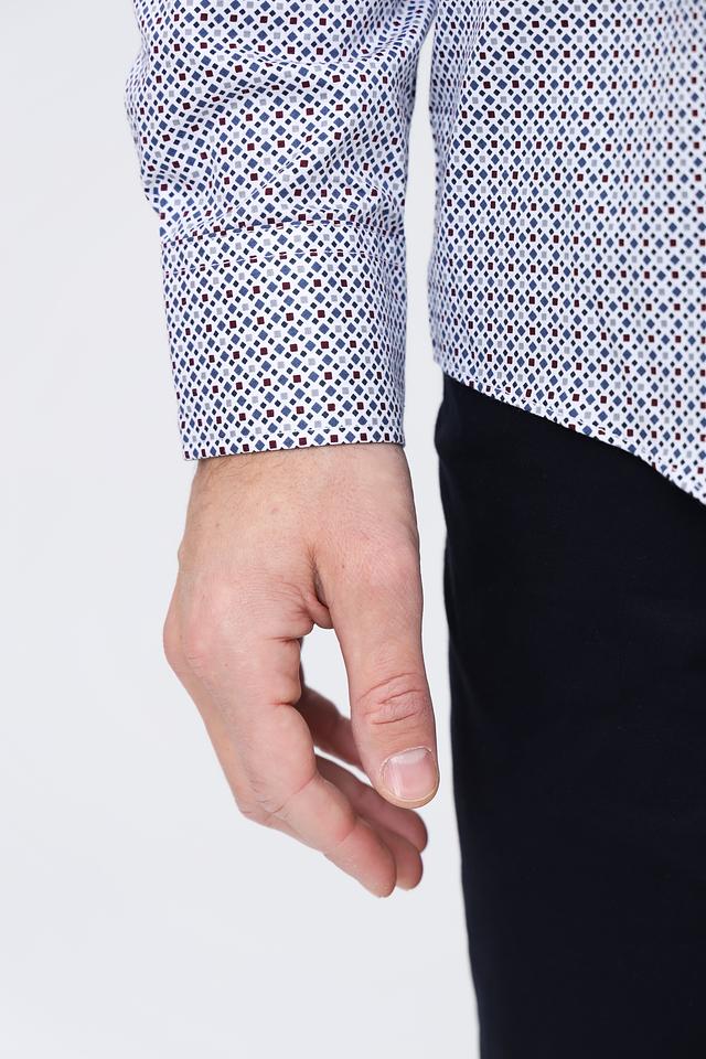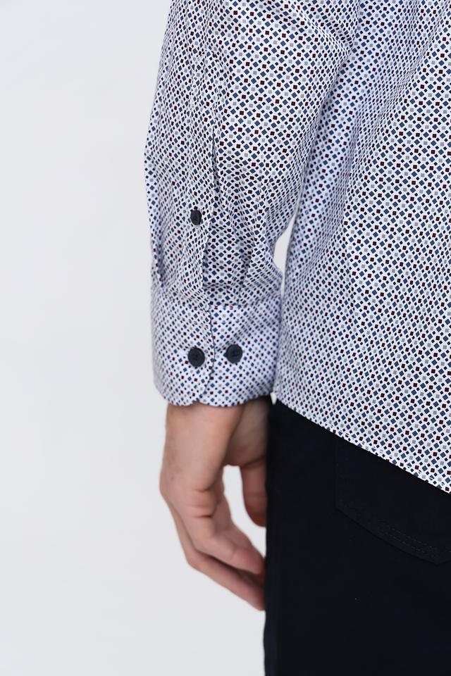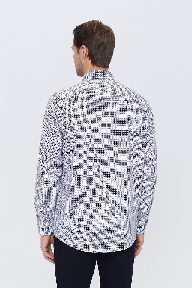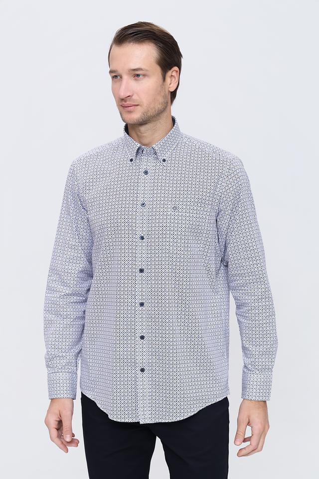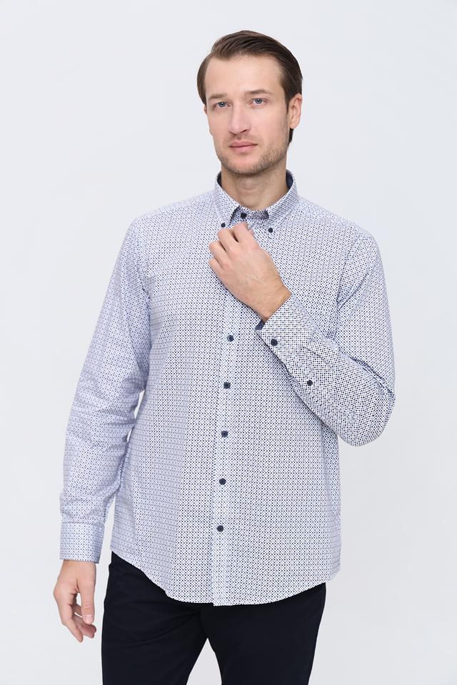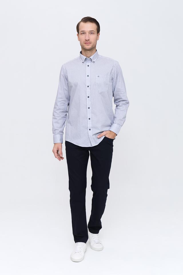 Рубашка имеет классический крой с длинными рукавами и воротником на пуговицах. Особенностью модели является стильный голубой цвет и мелкий геометрический принт, который придаёт ей современный вид.