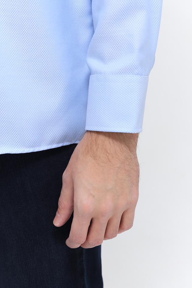 Рубашка имеет классический воротник, манжеты на пуговицах и нагрудный карман. Тёмные пуговицы контрастируют с голубым цветом ткани, добавляя рубашке элегантности. Текстура ткани с мелким рисунком придает рубашке дополнительный интерес.