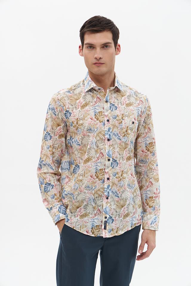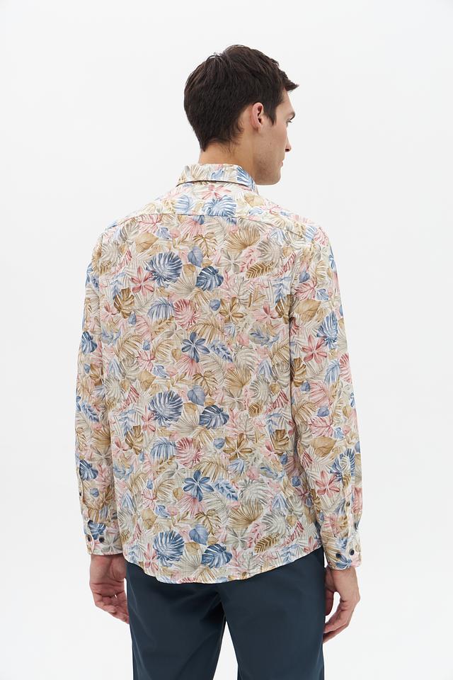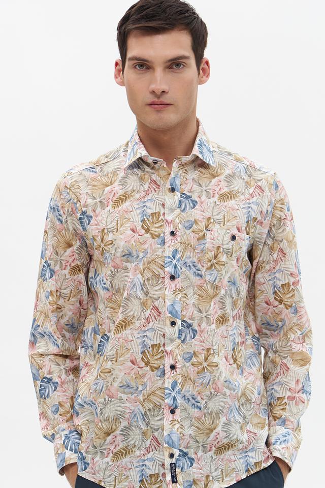 Эта стильная мужская рубашка от Casa Moda выполнена в светло-бежевом цвете и украшена ярким тропическим принтом с изображением листьев и цветов.