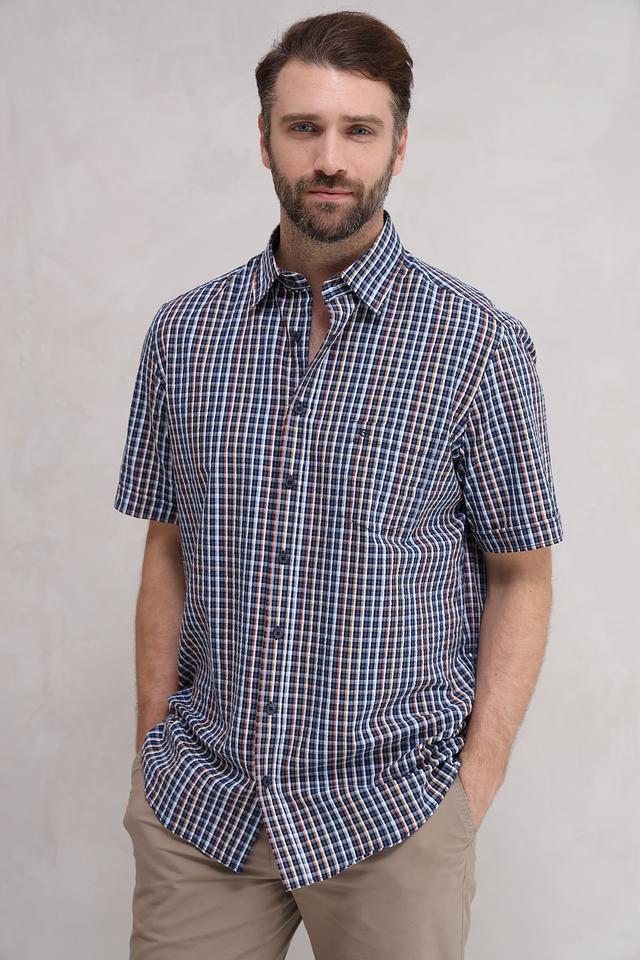 Рубашка имеет классический крой с короткими рукавами, что делает ее идеальной для повседневной носки. Особенностью модели является яркий клетчатый принт, сочетающий в себе оттенки синего, коричневого и белого. Воротник рубашки выполнен в классическом стиле.