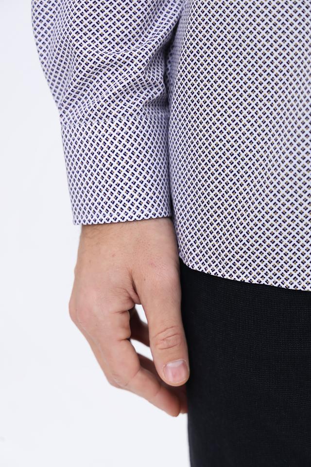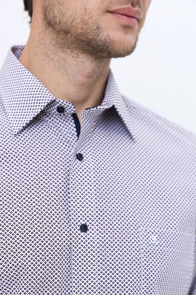 Рубашка имеет классический крой, длинный рукав и стандартную воротничковую стойку. Она выполнена в сером цвете с мелким геометрическим рисунком, который придает ей изысканность и оригинальность. Застежка на пуговицах, манжеты на пуговицах.