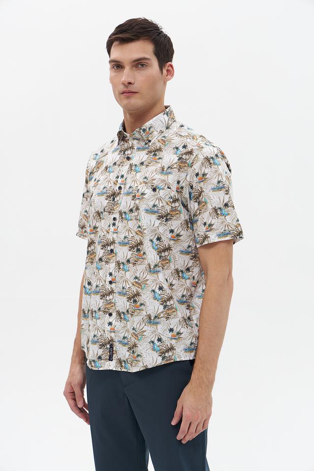 Мужская рубашка Casa Moda с коротким рукавом, выполненная в бежевом цвете с ярким тропическим принтом. Изготовлена из 100% хлопка, обеспечивающего комфорт и воздухопроницаемость. Состав: хлопок 100%