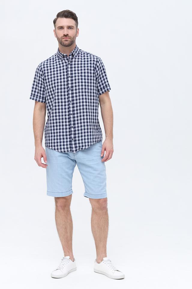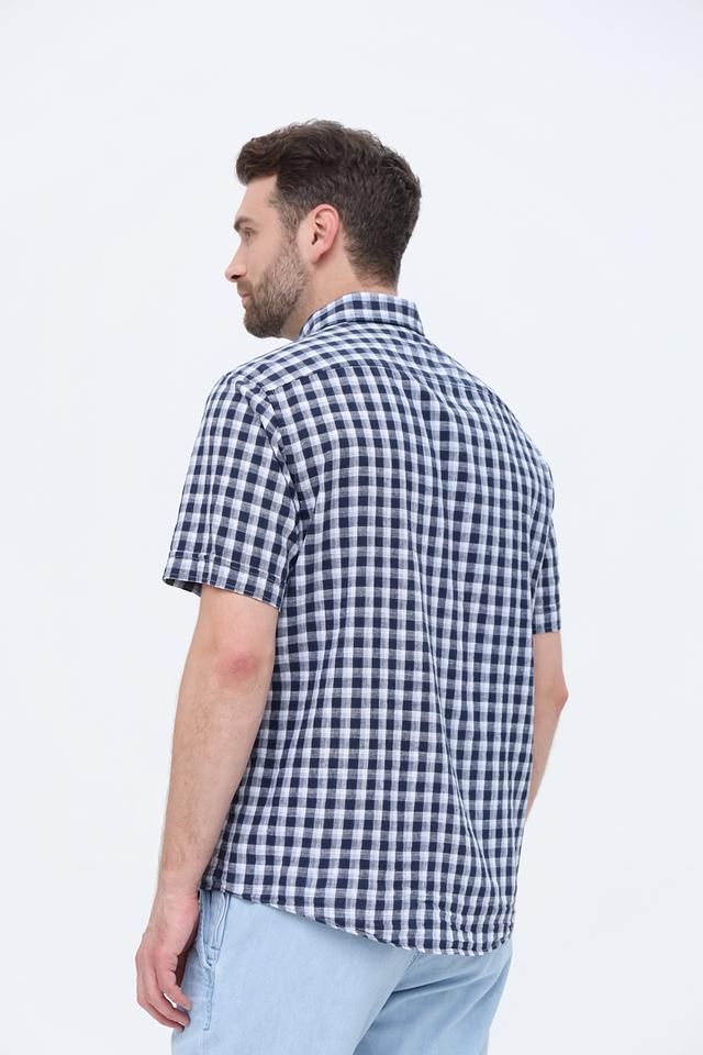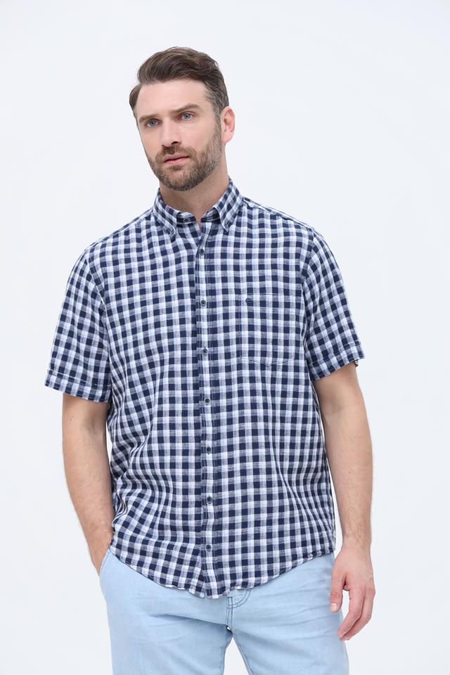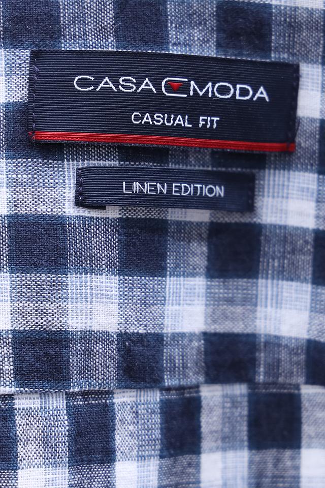 Мужская рубашка Casa Moda синего цвета с коротким рукавом выполнена в классической клетку. Изготовлена из натурального льна и хлопка, обеспечивая комфорт и воздухопроницаемость в жаркую погоду. Состав: лен 55%, хлопок 45%