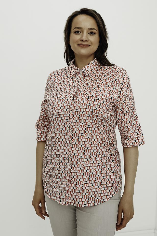 Рубашка имеет классический крой с короткими рукавами и воротником. Её отличает яркий геометрический принт, выполненный в сочетании красного, белого и синего цветов, который придаёт ей оригинальность и привлекательность.
