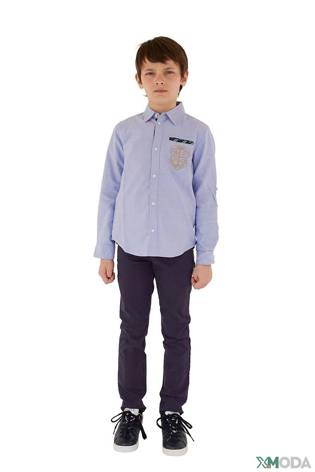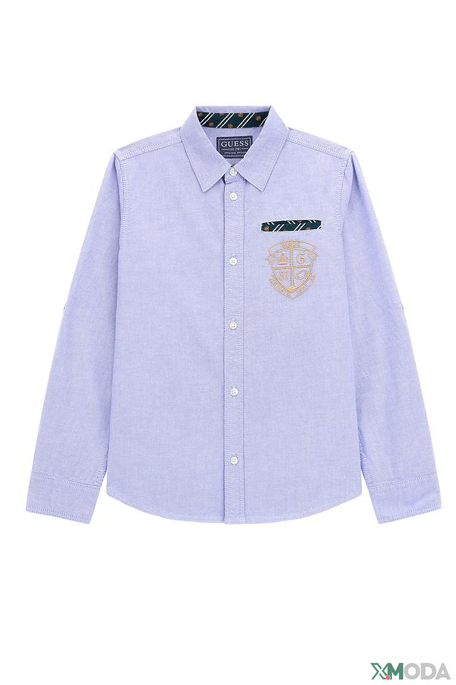 Голубая рубашка от Guess для мальчиков, выполненная из 100% хлопка. Модель с длинным рукавом украшена вышитым гербом на груди и декоративной полоской на манжетах. Состав: хлопок 100%
