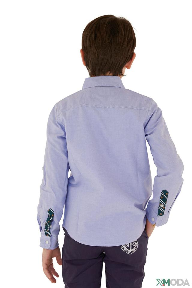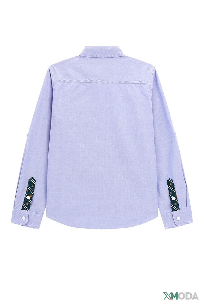 Рубашка голубого цвета имеет классический крой с длинными рукавами и стандартным воротником. Особый акцент сделан на декоративные элементы: вышитый герб на груди и яркая полоска на манжетах рукавов, добавляющие образу индивидуальность.