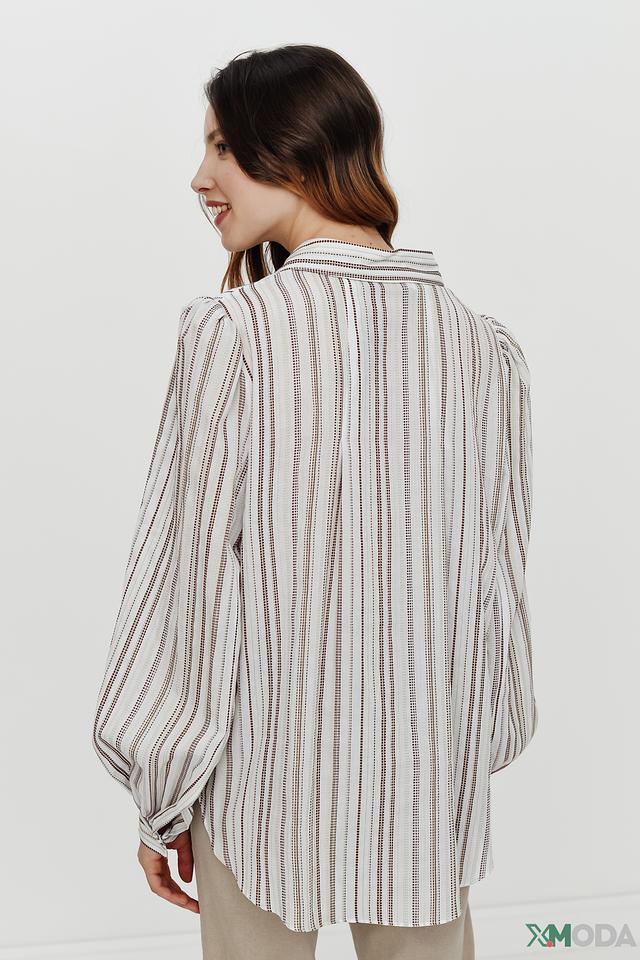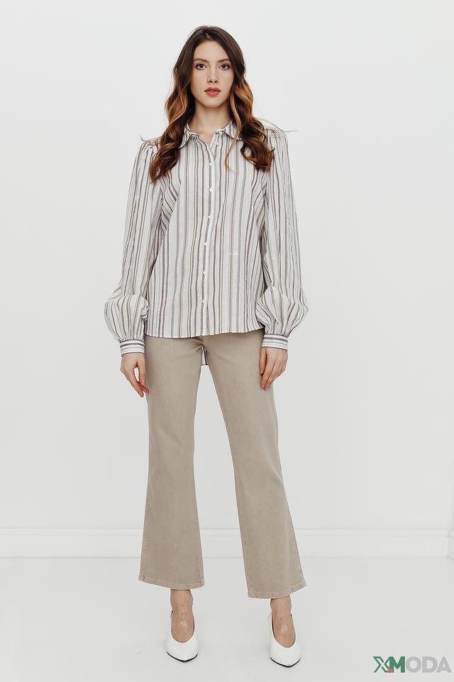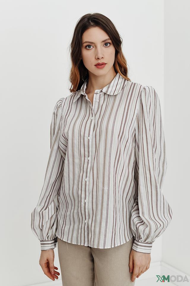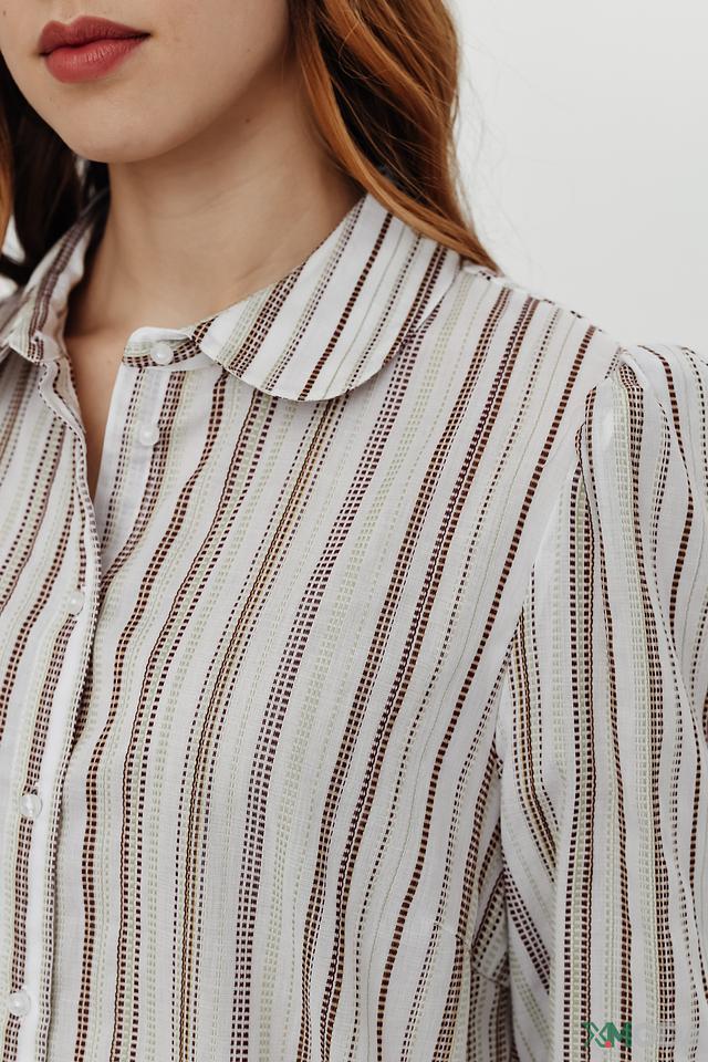 Рубашка имеет классический крой с отложным воротником и застежкой на пуговицы. Особый акцент сделан на рукавах-фонариках, которые придают образу романтичность и женственность. Модель выполнена из высококачественного 100% хлопка, что обеспечивает комфорт в носке и приятные тактильные ощущения.