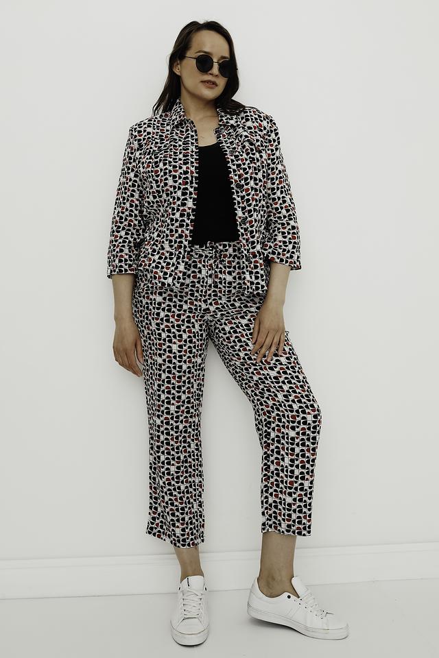 Рубашка имеет прямой крой, воротник и застёжку на пуговицы. Её отличает яркий геометрический принт, сочетающий в себе белый фон и узоры в чёрном и красном цветах. Рукава рубашки – три четверти.