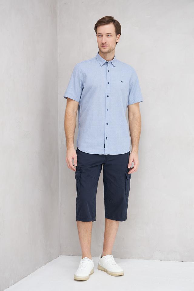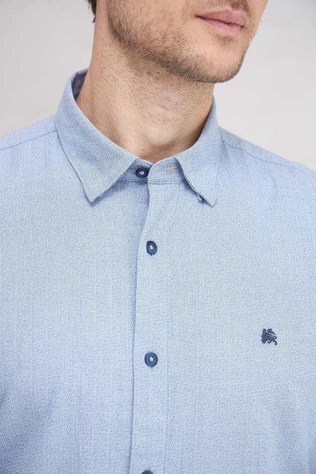 Рубашка имеет классический крой, подходящий для различных типов фигур. Голубой цвет с мелким рисунком придает ей свежий и современный вид. На груди расположена небольшая вышивка с логотипом бренда.