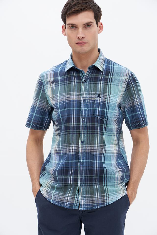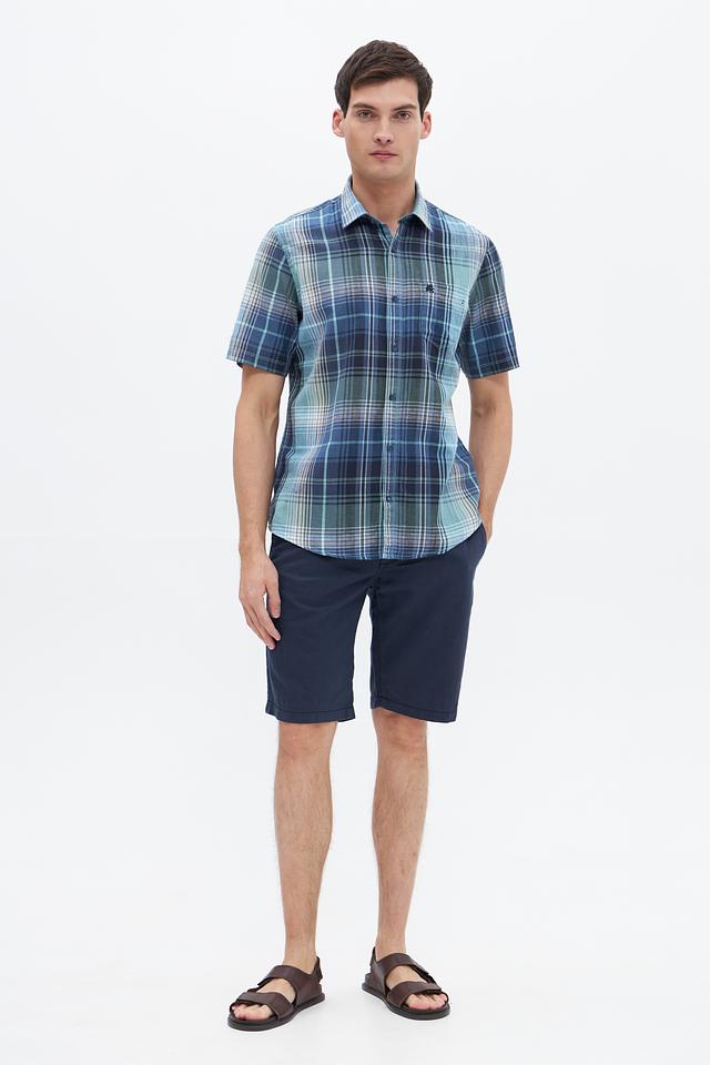 Мужская рубашка Lerros с коротким рукавом выполнена в сине-зелёной клетке. Модель с классическим воротником и нагружным карманом станет отличным дополнением к летнему гардеробу. Состав: хлопок 71%, лен 29%