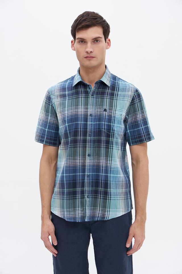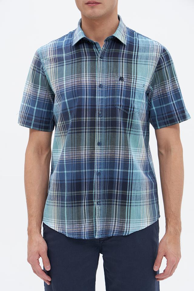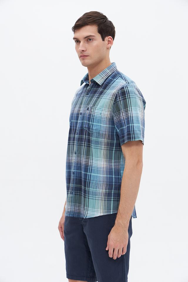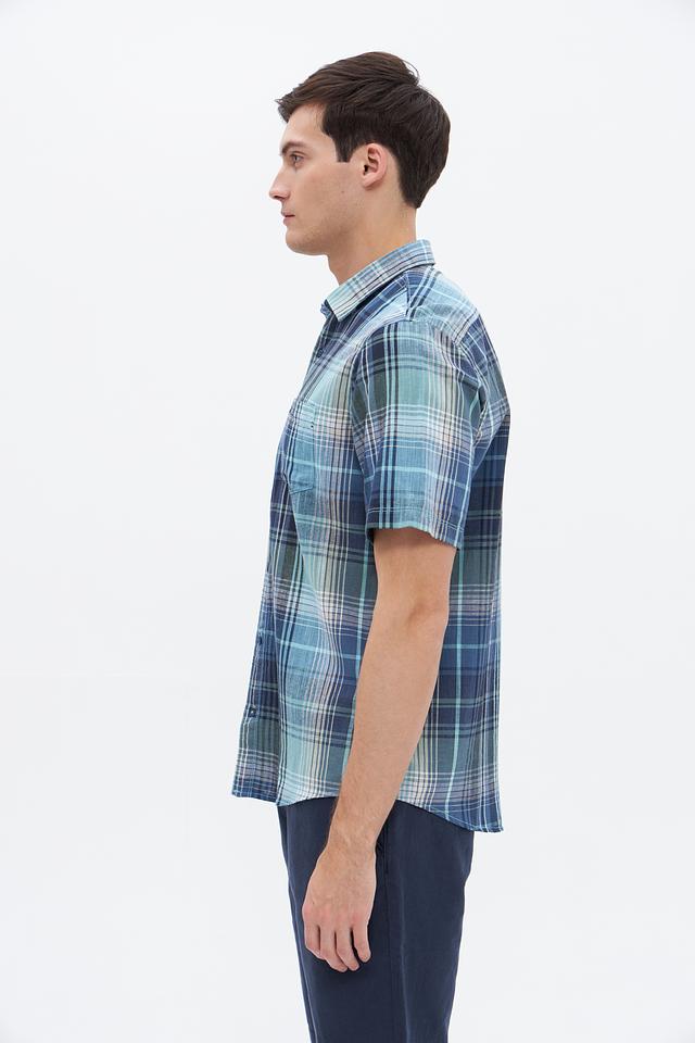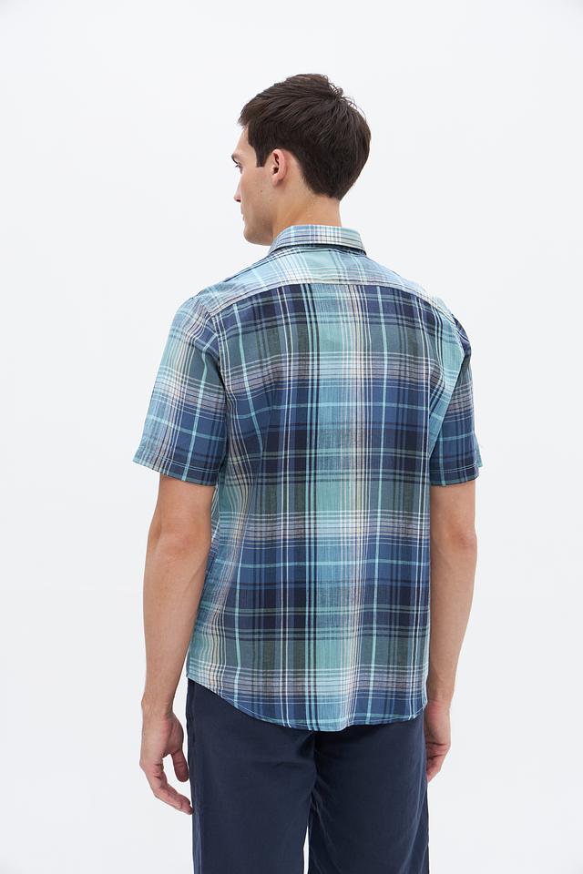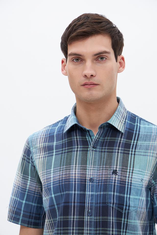 Рубашка имеет классический крой, короткие рукава и традиционный воротник. Особенностью модели является яркий клетчатый принт в сине-зелёных тонах, который придаёт ей свежий и современный вид. Нагрудный карман добавляет функциональности и акцентирует внимание на деталях.