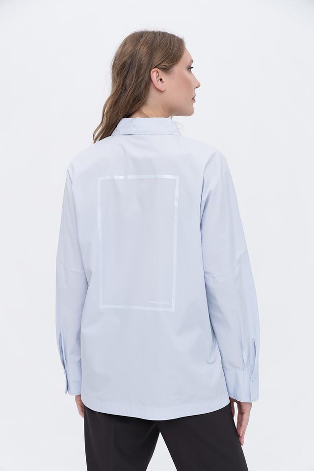 Рубашка имеет классический крой с длинными рукавами и отложным воротником. На спине расположена декоративная вставка в виде светлого прямоугольника, добавляющая оригинальности. Прямой силуэт обеспечивает свободу движений и подходит для различных типов фигур.