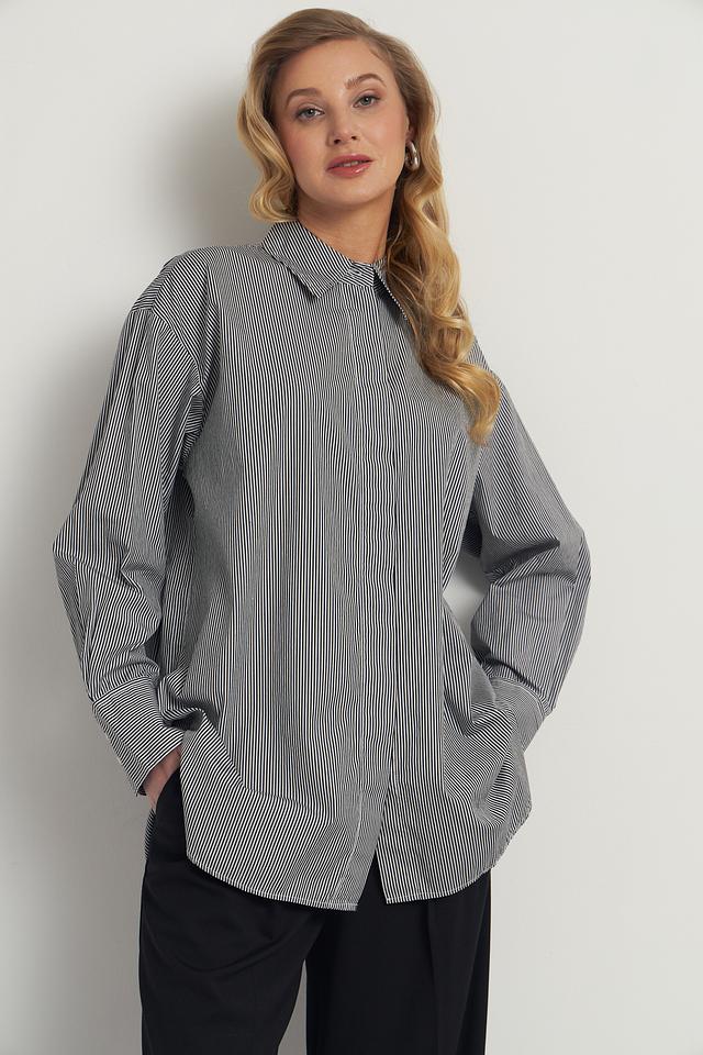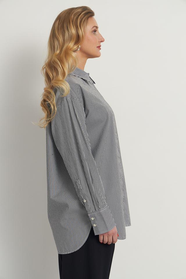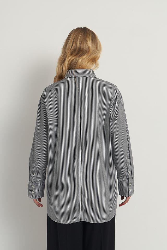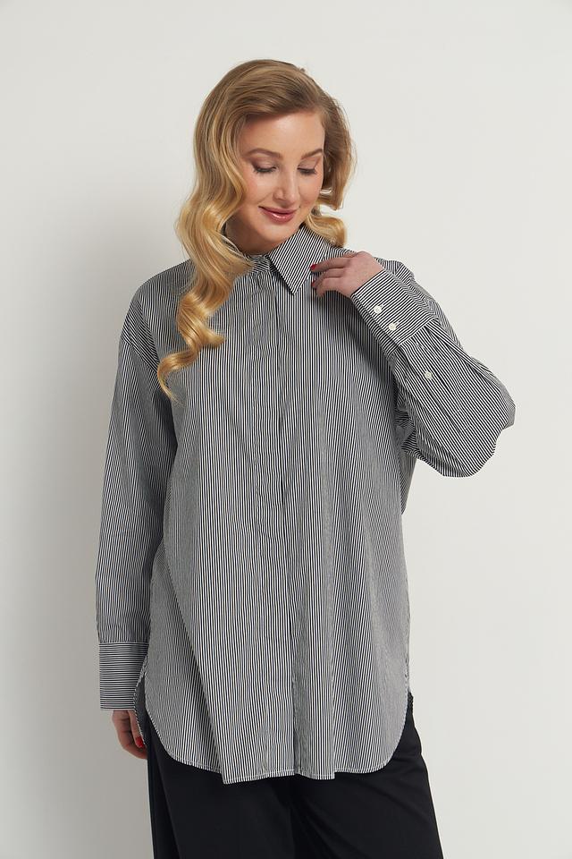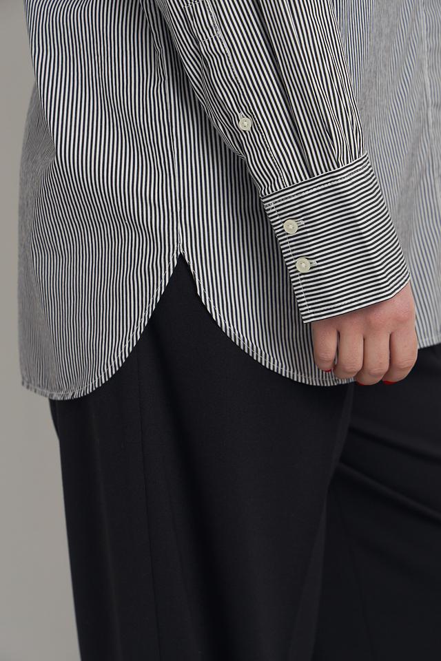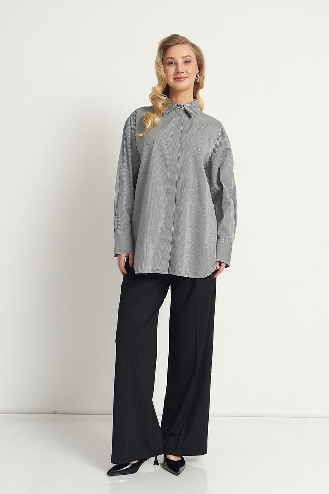 Модель имеет прямой крой, длинные рукава с манжетами на пуговицах и классический отложной воротник. Рубашка оформлена вертикальной полоской серого и белого цветов, что придает ей элегантный и универсальный вид.