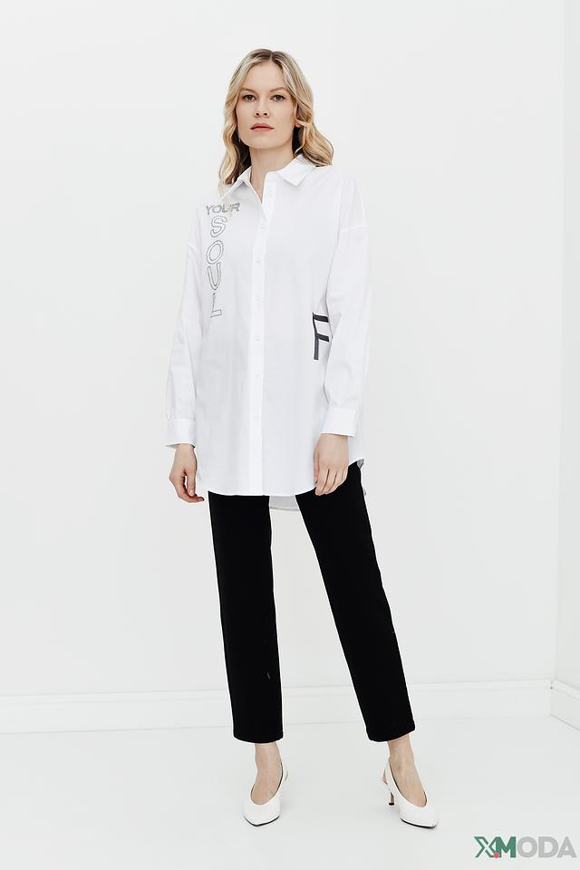 Белая рубашка Betty Barclay свободного кроя с оригинальной надписью "YOUR SOUL" и геометрическим принтом. Модель выполнена из хлопка с добавлением полиэстера и эластана, что обеспечивает комфорт и удобство в носке. Состав: хлопок 70%, полиэстер 27%, эластан 3%