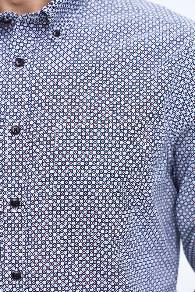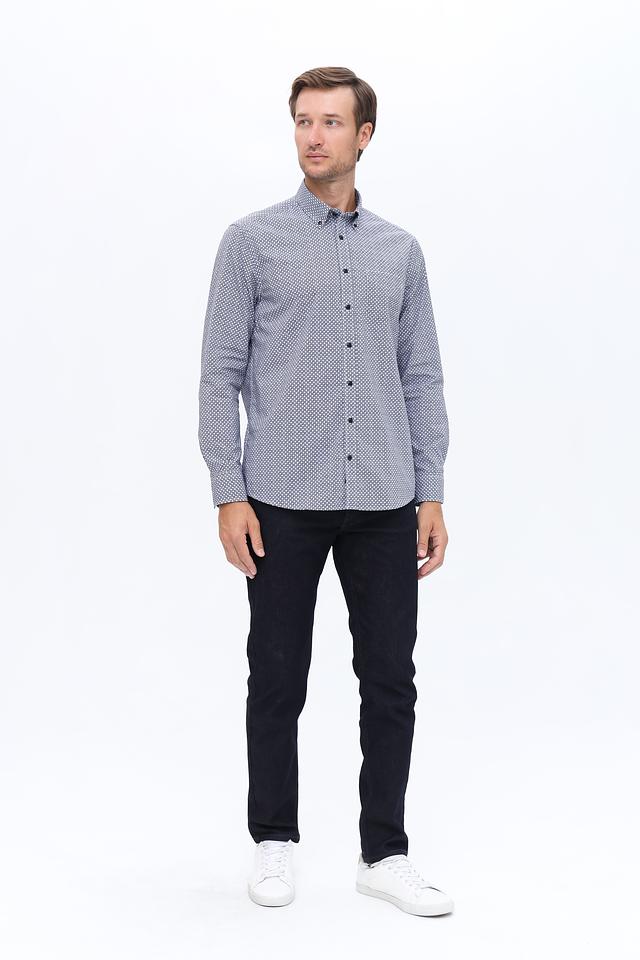 Основной цвет рубашки – синий, дополненный мелким геометрическим рисунком в белых и тёмно-синих тонах. Воротник рубашки классический, с небольшими закруглениями. Застежка выполнена на пуговицах в тон ткани.