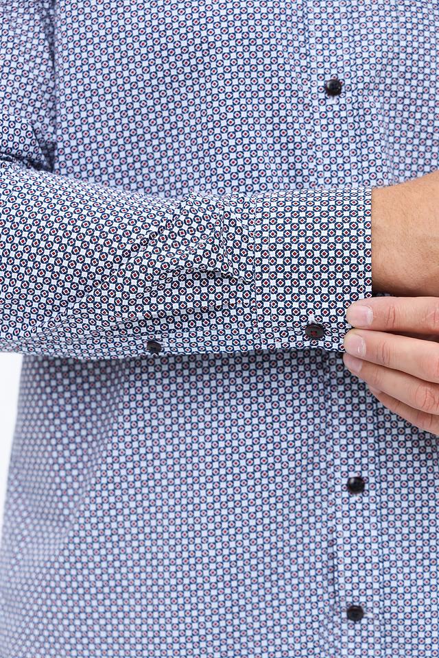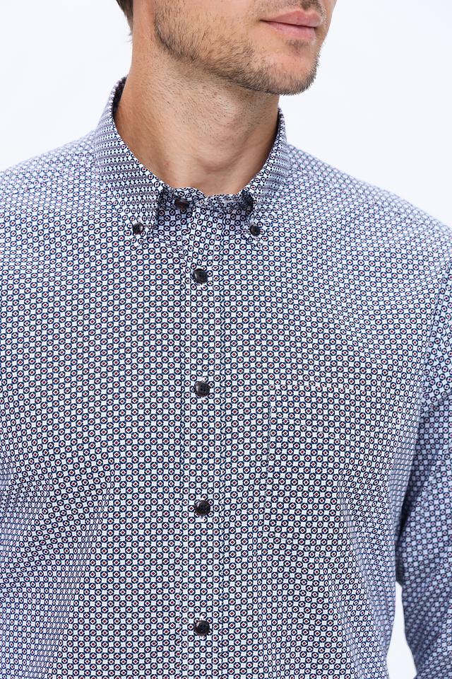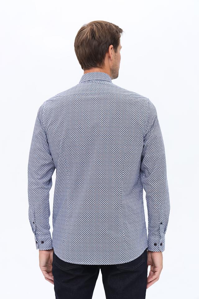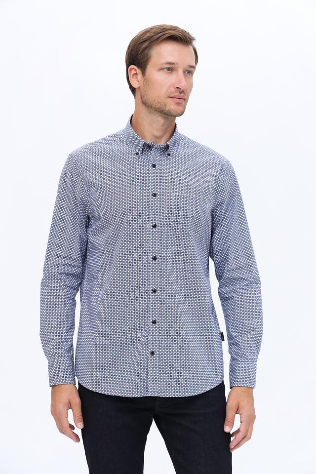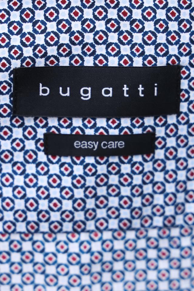 Мужская рубашка Bugatti синего цвета с мелким геометрическим рисунком. Классический крой и 100% хлопковый состав обеспечивают комфорт и удобство в носке. Идеально подходит для создания стильного повседневного образа. Состав: хлопок 100%