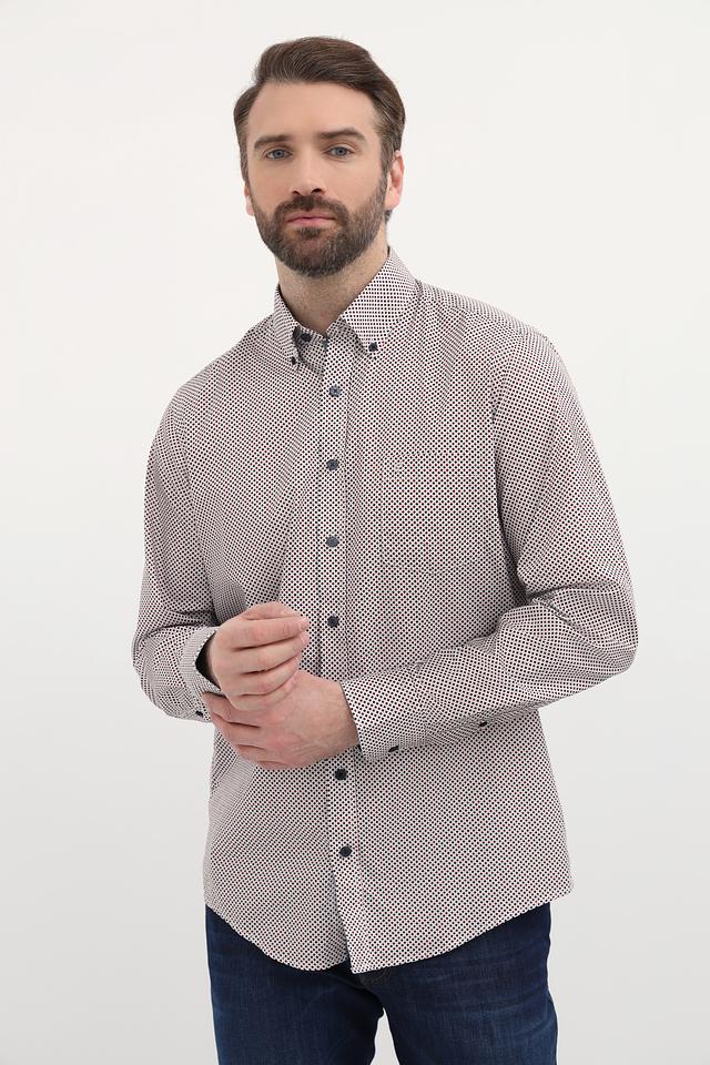 Рубашка имеет классический крой с длинными рукавами и стандартной посадкой. Её отличает оригинальный принт в мелкий рисунок, выполненный в сочетании бежевого и тёмно-синего цветов. Воротник рубашки выполнен в классическом стиле, а пуговицы подобраны в тон рисунку.