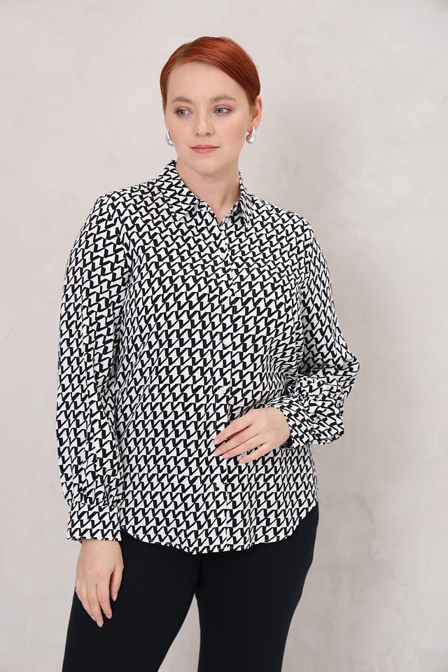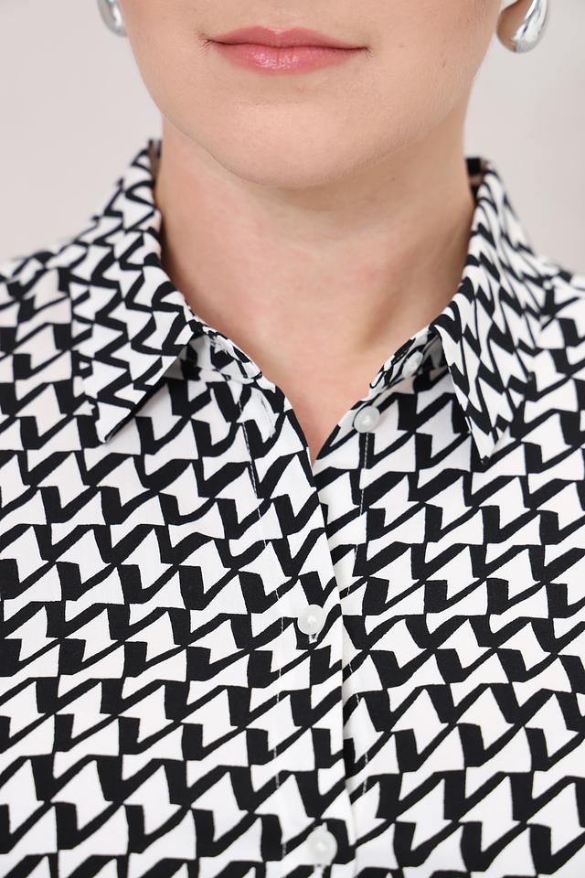 Основной цвет рубашки – белый, но её украшает эффектный геометрический принт чёрного цвета, создающий контрастный и запоминающийся образ. Рубашка выполнена из 100% вискозы, что делает её приятной к телу и обеспечивает комфорт при ношении.