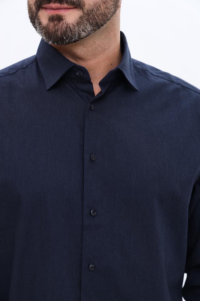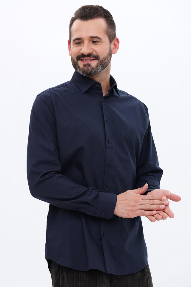 Рубашка имеет длинные рукава, стандартный воротник и застежку на пуговицы. Тёмно-синий цвет делает её универсальной и подходящей для различных случаев – от деловых встреч до повседневной носки. Прямой крой обеспечивает свободу движений и комфортную посадку по фигуре.