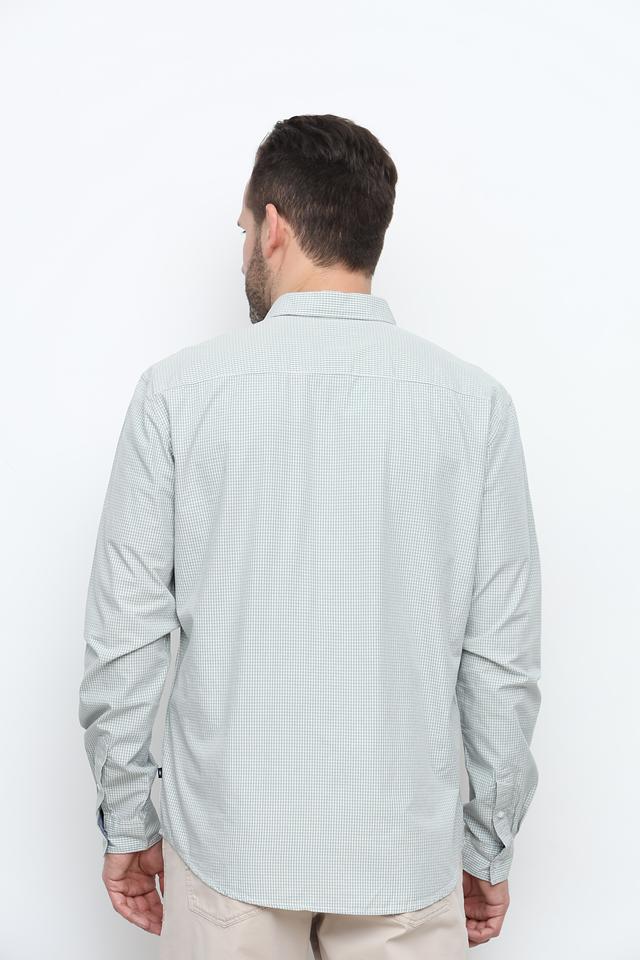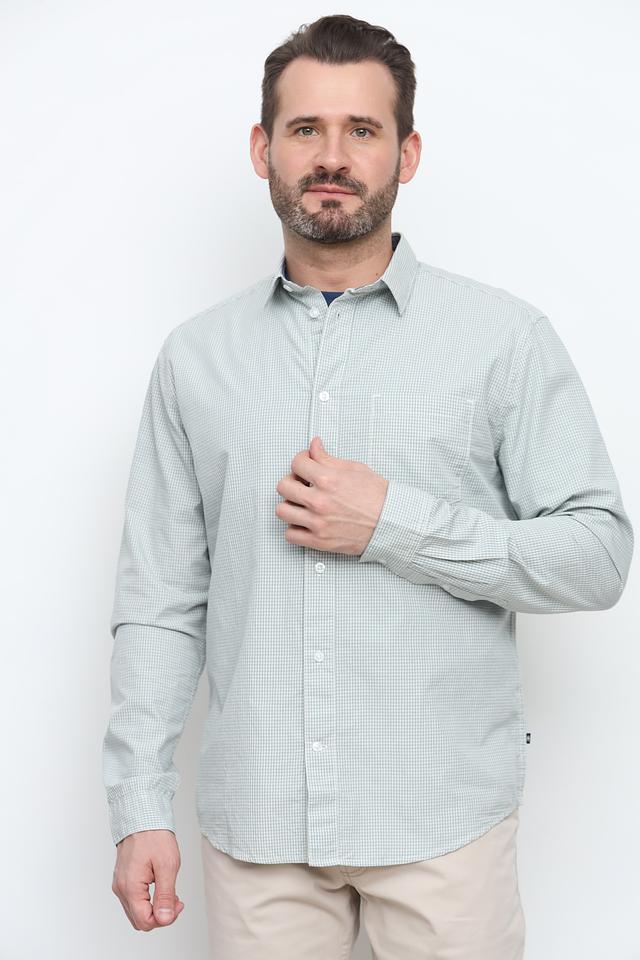 Рубашка имеет классический крой, длинные рукава и воротник с пуговицами. Особенностью модели является мелкая клетка светло-зелёного и белого цветов.