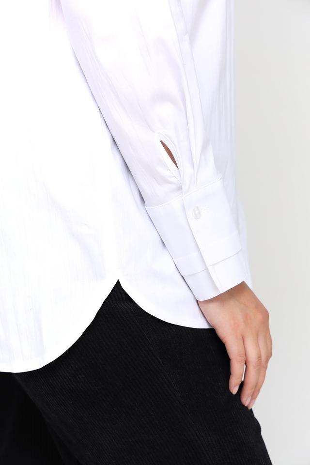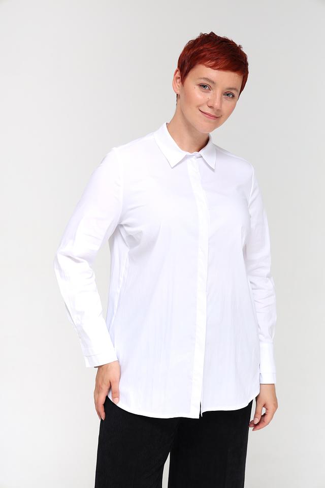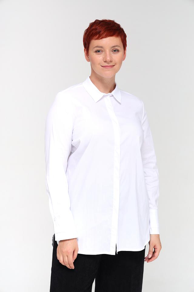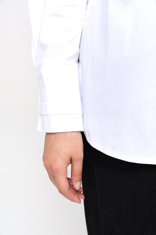 Рубашка имеет приталенный силуэт, который подчеркивает фигуру, и длинные рукава с манжетами на пуговицах. Воротник рубашки классической формы, что делает ее универсальной для различных случаев.