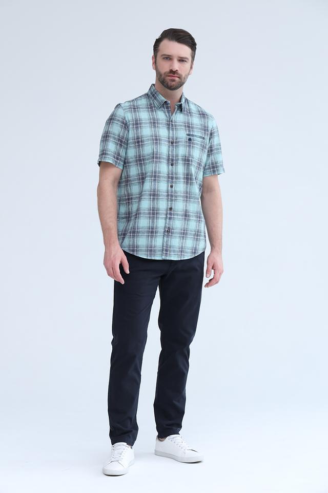 Рубашка имеет короткий рукав, что делает ее идеальной для теплой погоды. Воротник рубашки классический, с пуговицами. Материал – сочетание 65% полиэстера и 35% хлопка, что обеспечивает легкость, прочность и комфорт в носке.