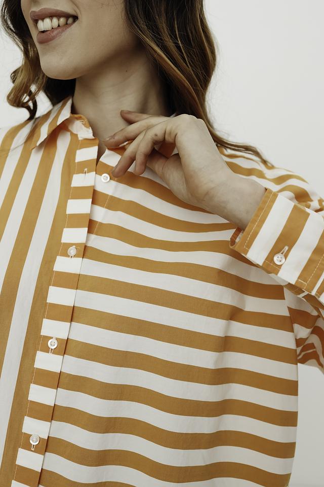 Рубашка имеет классический крой с длинными рукавами и воротником. Особенностью модели является яркий оранжевый цвет в сочетании с белыми полосками, создающими стильный и динамичный образ.