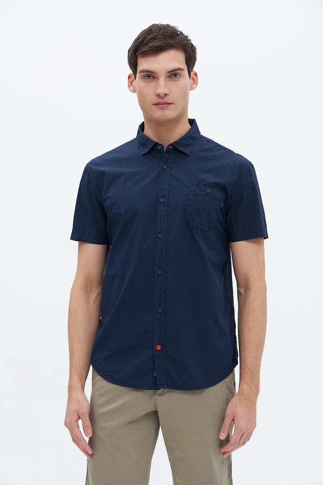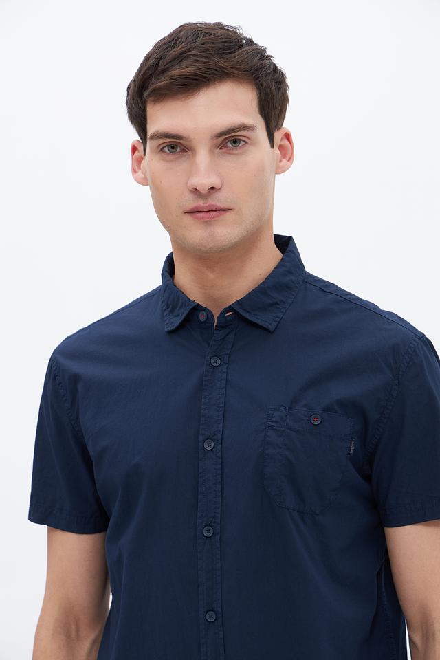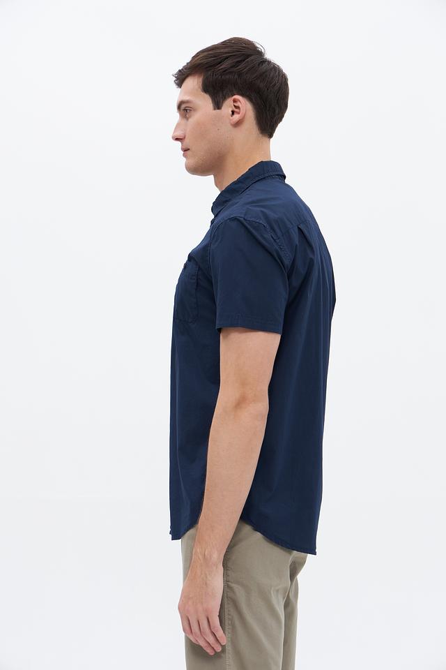 Рубашка имеет прямой силуэт, воротник на пуговицах и нагрудный карман с клапаном. Застежка на пуговицы по всей длине. Цвет рубашки – насыщенный синий, который легко сочетается с различными элементами одежды.
