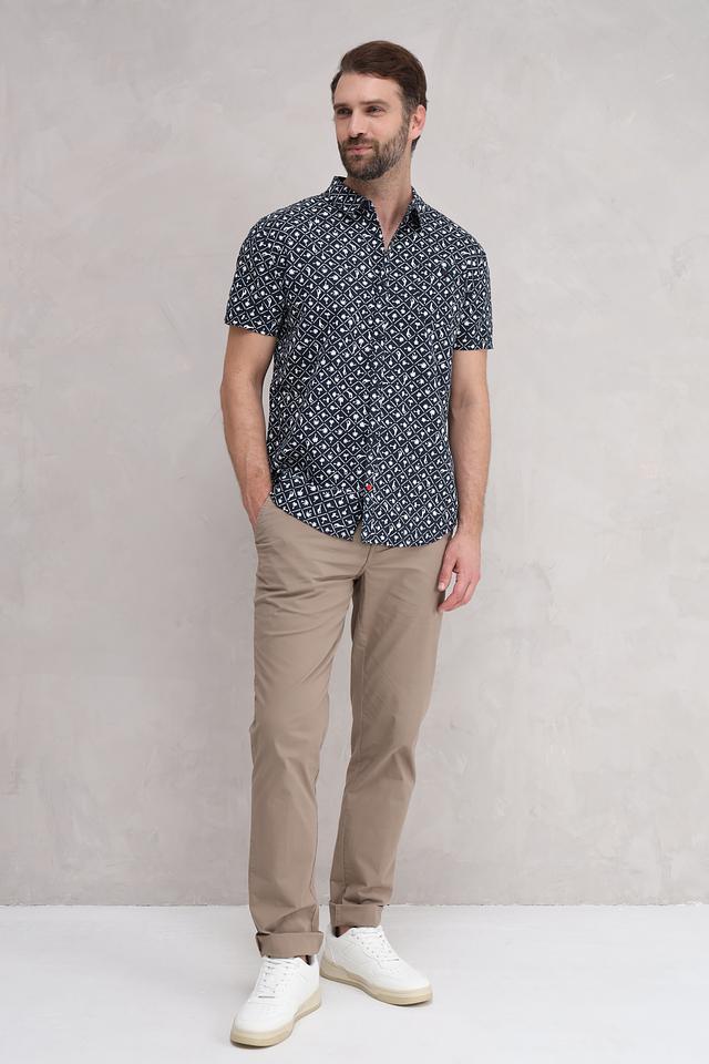 Мужская рубашка Time Zone темно-синего цвета с коротким рукавом и оригинальным геометрическим принтом. Изготовлена из натурального смесового материала, обеспечивающего комфорт и воздухопроницаемость. Состав: лен 55%, хлопок 45%