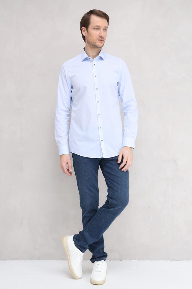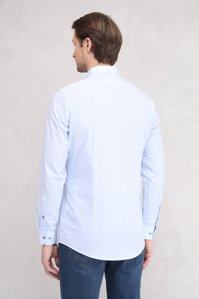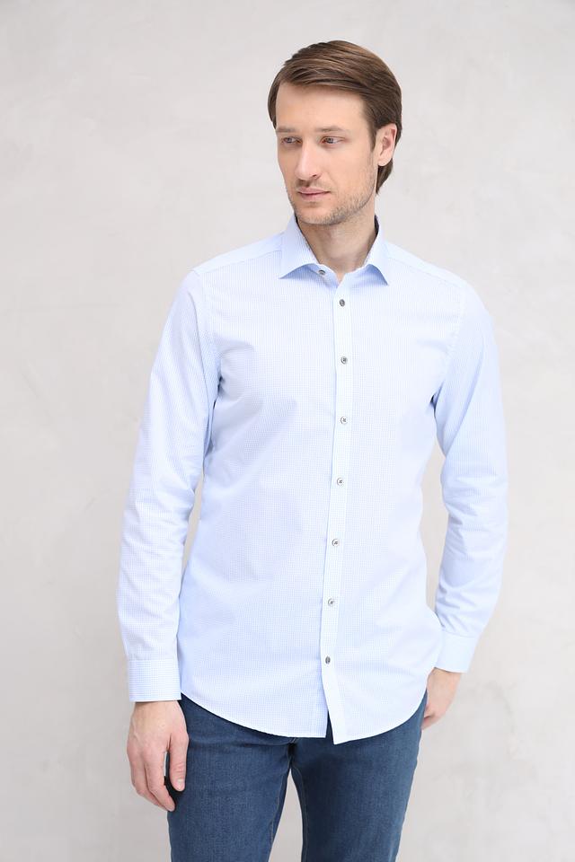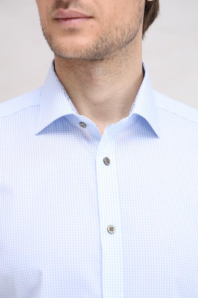 Рубашка имеет классический крой, который подходит для большинства типов фигур. Голубой цвет с мелким клетчатым рисунком придает ей свежий и современный вид. Воротник рубашки выполнен в классическом стиле, а застежка на пуговицах обеспечивает надежную фиксацию.