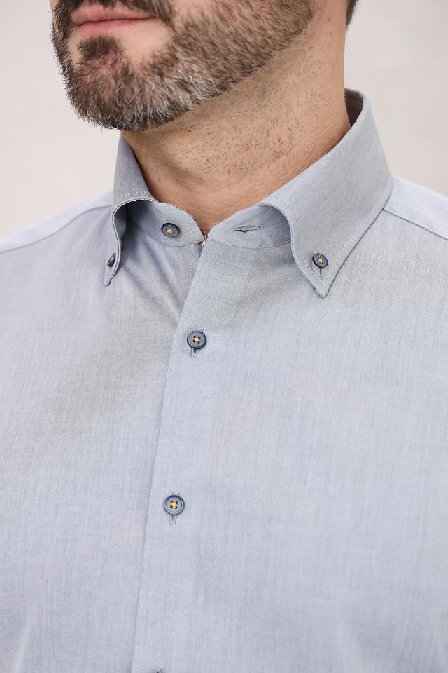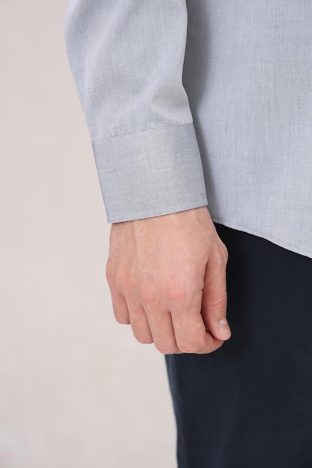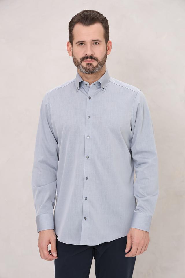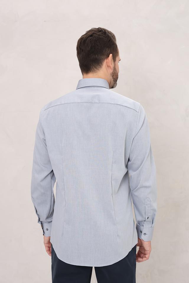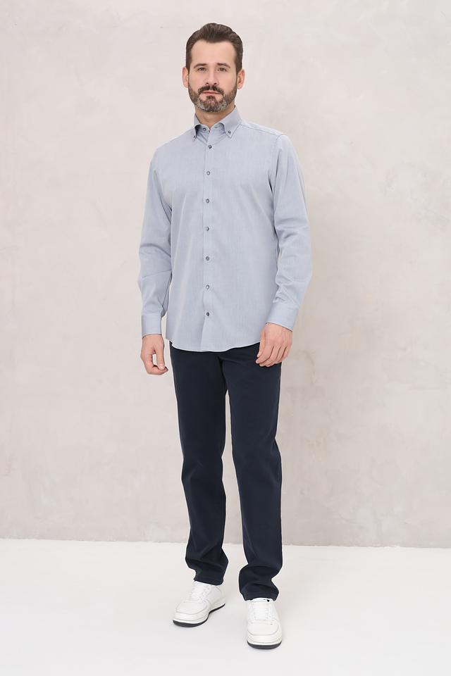 Рубашка имеет классический крой с длинными рукавами и приталенный силуэт, который подчеркивает фигуру. Голубой цвет придает ей свежесть и универсальность, позволяя легко сочетать с различными брюками и аксессуарами.