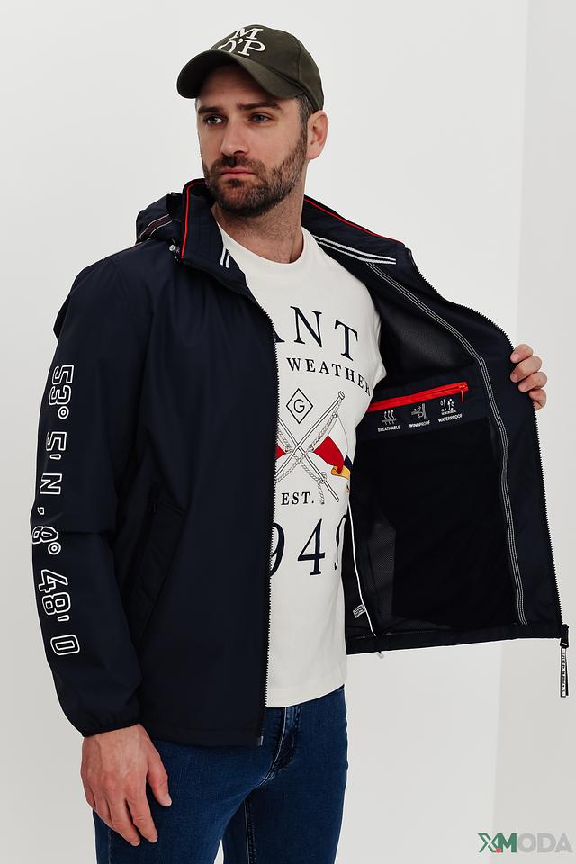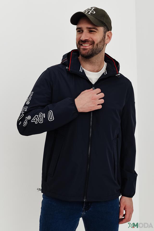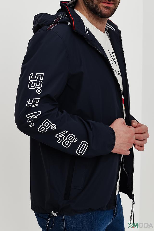 Куртка имеет удобный капюшон, который защитит от ветра и дождя. Застежка-молния обеспечивает надежную фиксацию, а боковые карманы позволяют удобно хранить необходимые вещи. На левом рукаве нанесена декоративная надпись с географическими координатами.