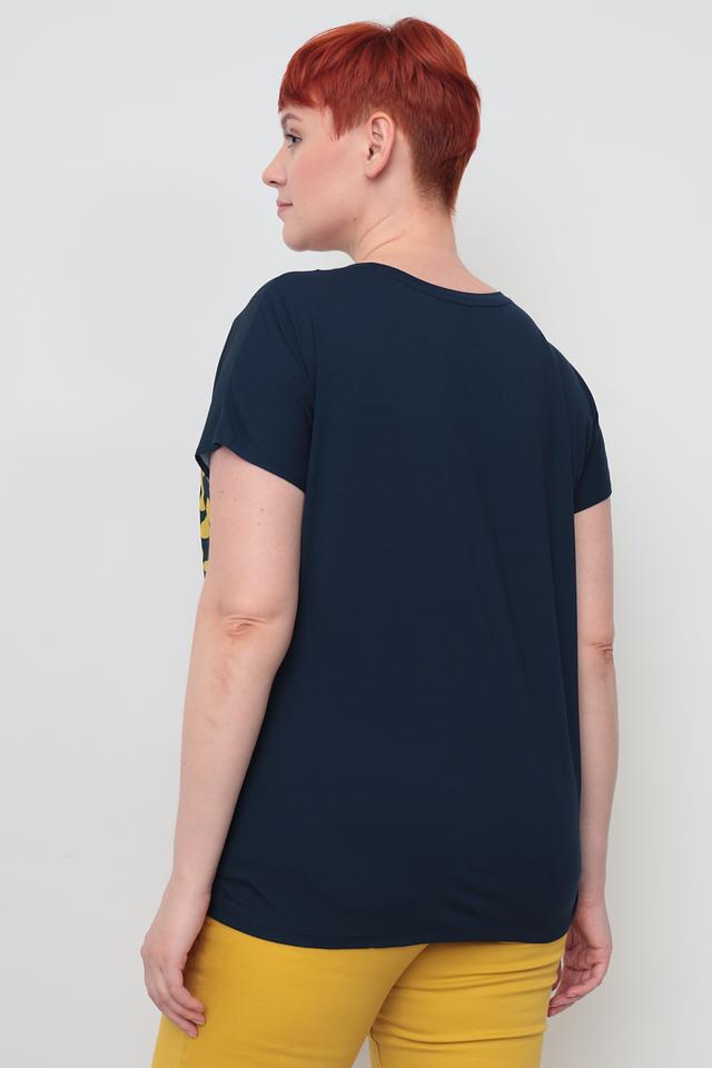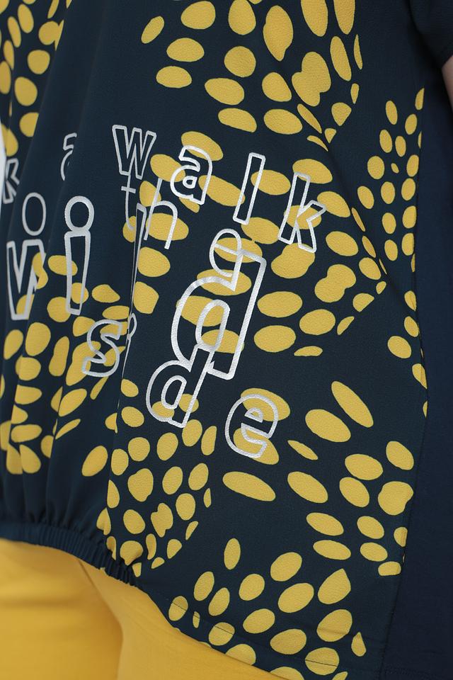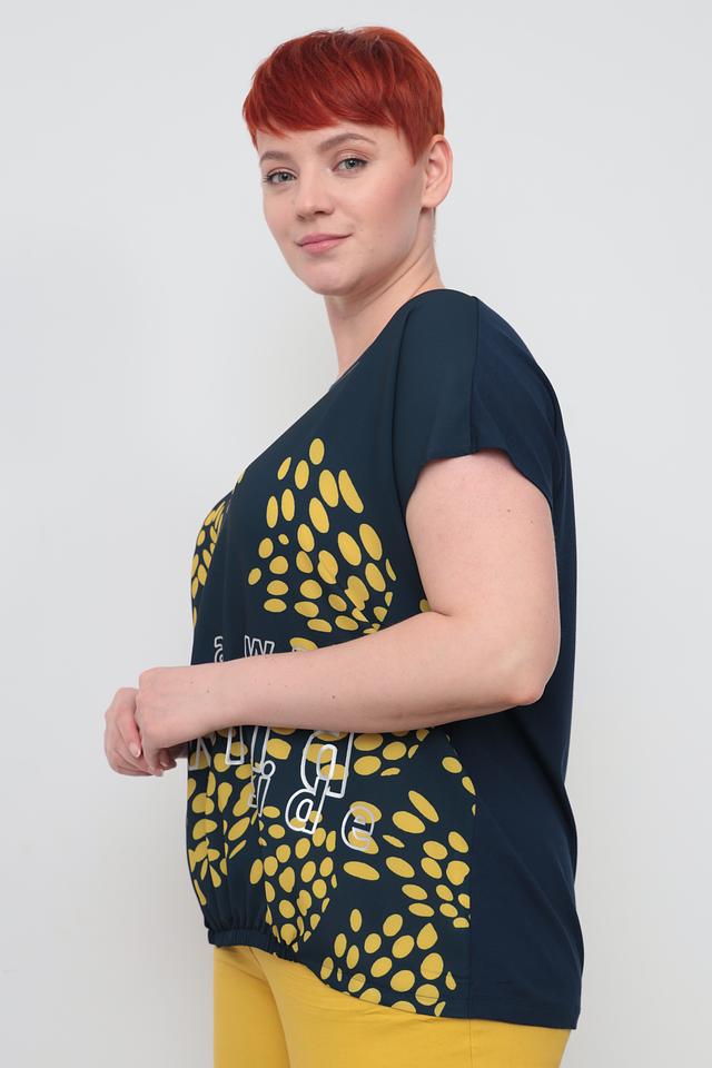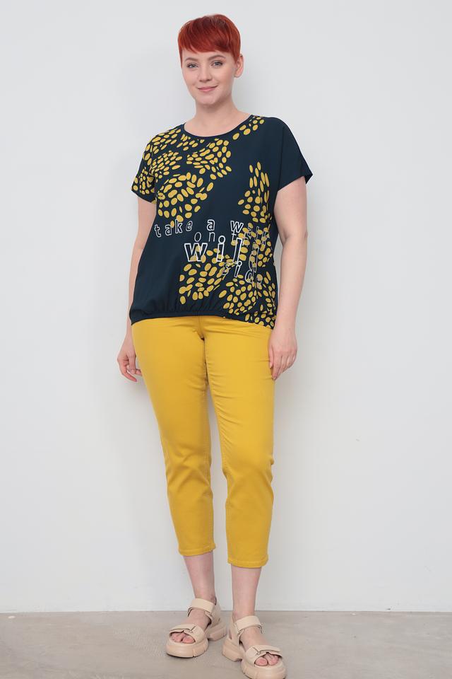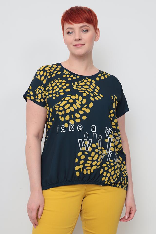 Тёмно-зелёная футболка Samoon с оригинальным принтом в виде жёлтых пятен и надписью "take a walk on the wild side". Изготовлена из мягкой вискозы с добавлением эластана для комфорта и свободы движений. Состав: вискоза 92%, эластан 8%