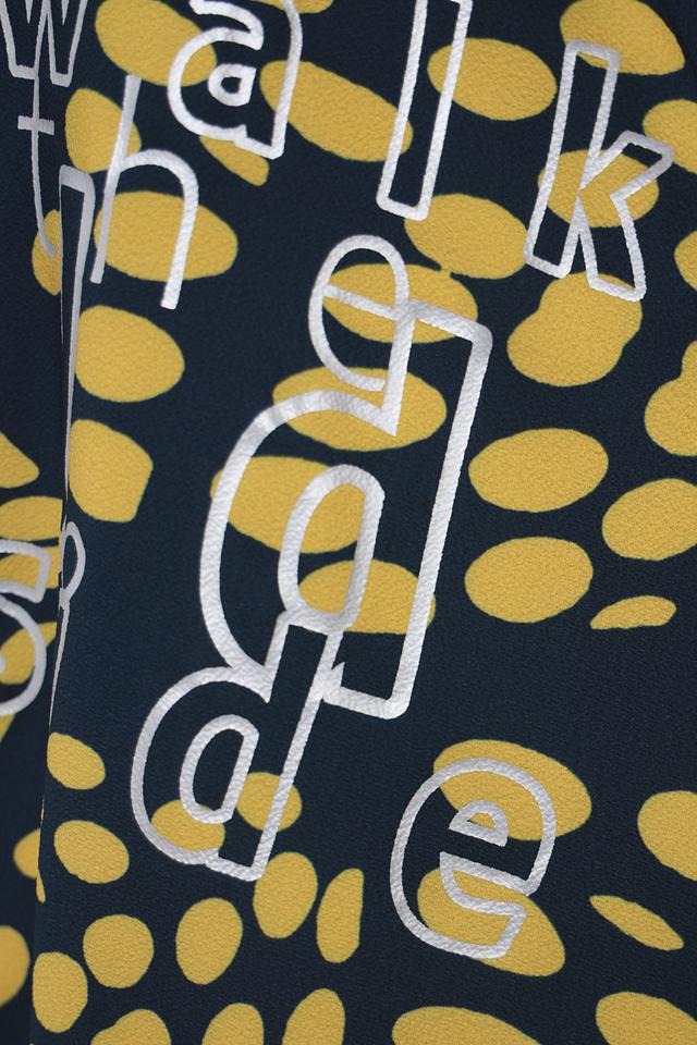 Основной цвет футболки – тёмно-зелёный, который выгодно подчеркивает жёлтый принт в виде абстрактных пятен и надпись "take a walk on the wild side". Принт расположен на лицевой стороне изделия.