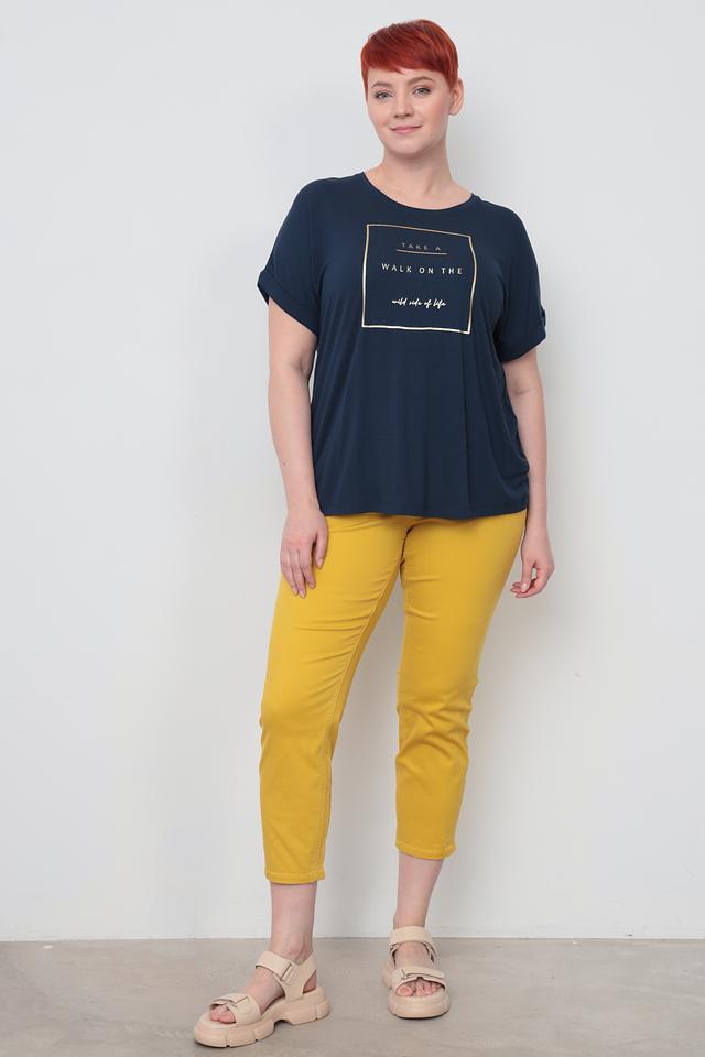 Женская футболка Samoon темно-синего цвета с оригинальным золотистым принтом. Модель выполнена из мягкой вискозы с добавлением эластана, обеспечивающего комфортную посадку. Идеальный выбор для создания повседневных образов. Состав: вискоза 95%, эластан 5%