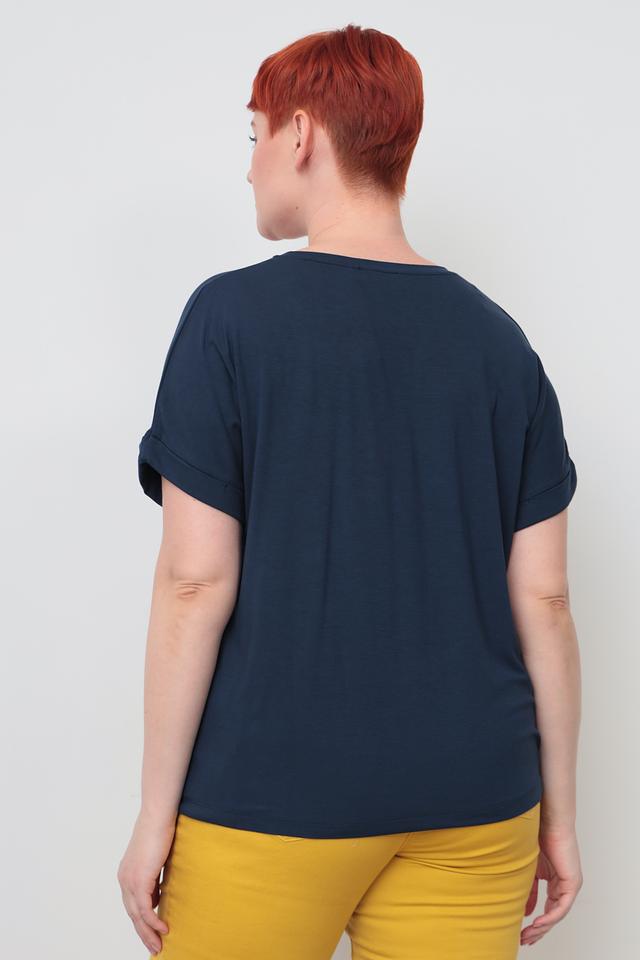 Футболка имеет прямой крой и короткие рукава с небольшим подворотом. Основной цвет – темно-синий, который легко сочетается с другими элементами одежды.