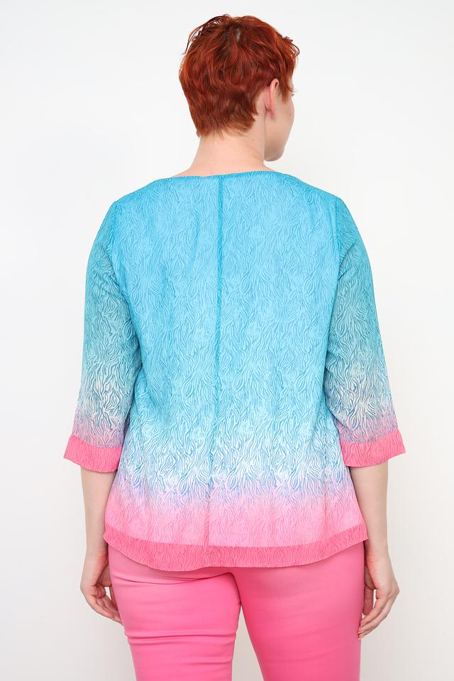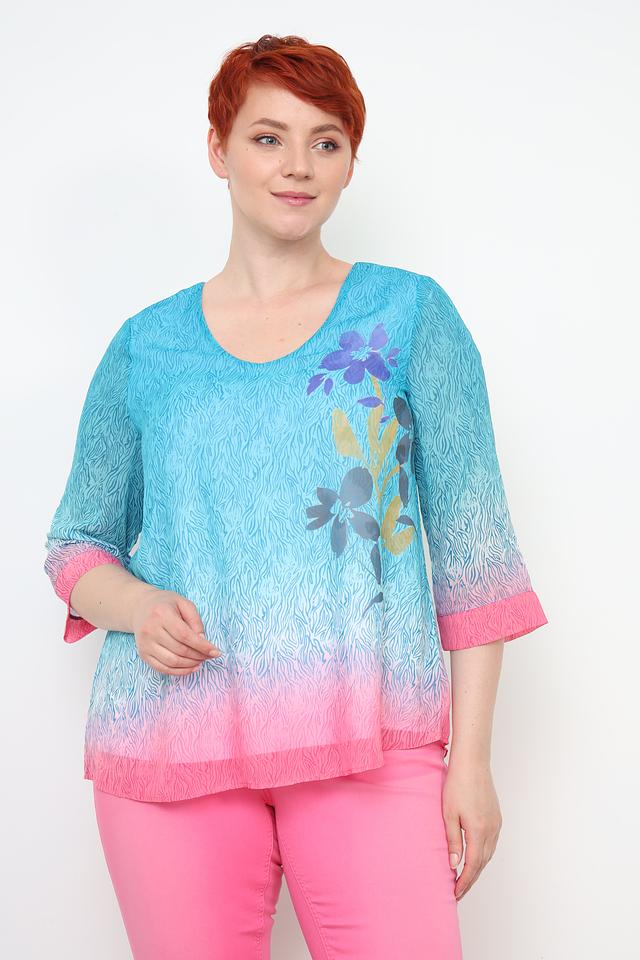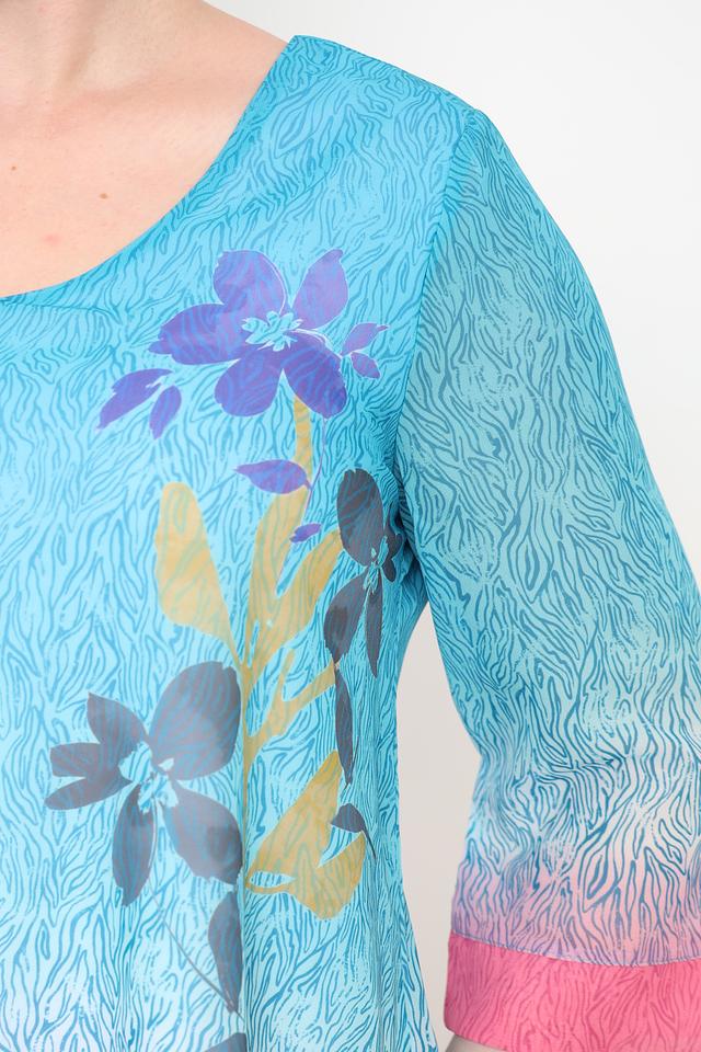 Основной цвет блузы – бирюзовый, с плавным переходом к розовому в нижней части. На блузе изображен яркий цветочный принт, выполненный в фиолетовых, синих и жёлтых тонах. Принт расположен спереди и на рукавах, добавляя образу оригинальности.