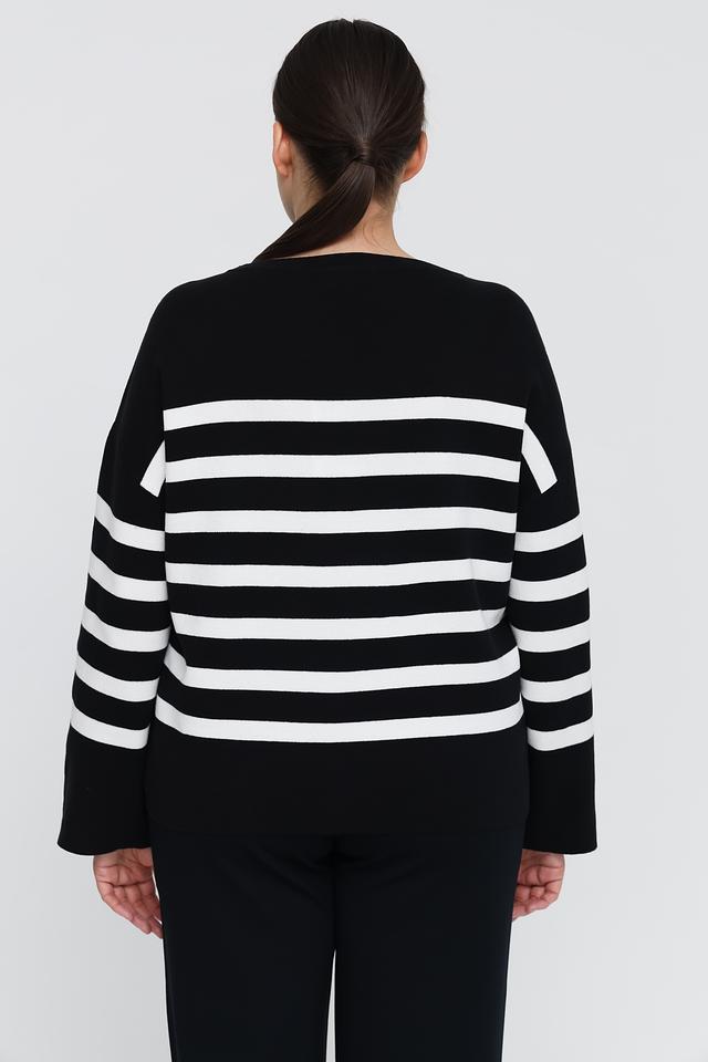 Классический чёрный цвет с белыми полосами делает этот пуловер универсальным и легко сочетаемым с различными элементами гардероба. Свободный крой не сковывает движений и позволяет создать расслабленный образ.