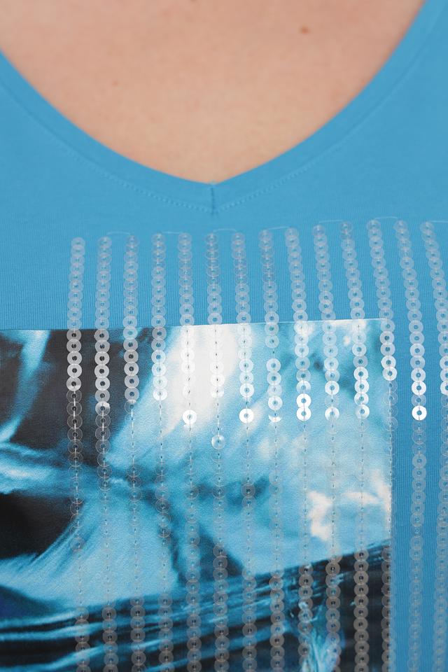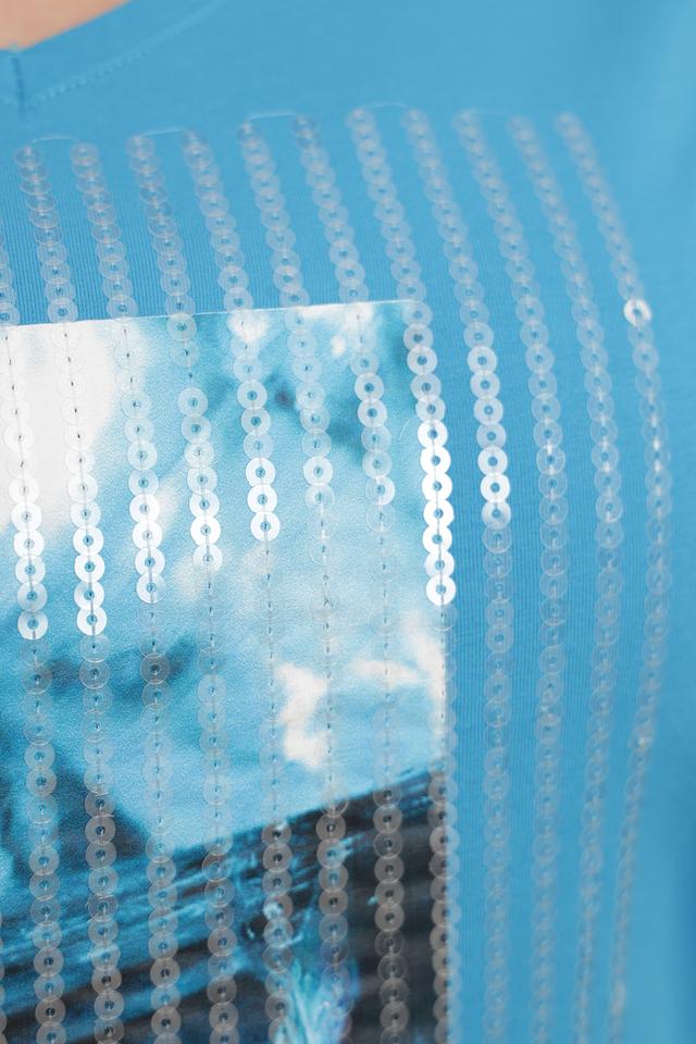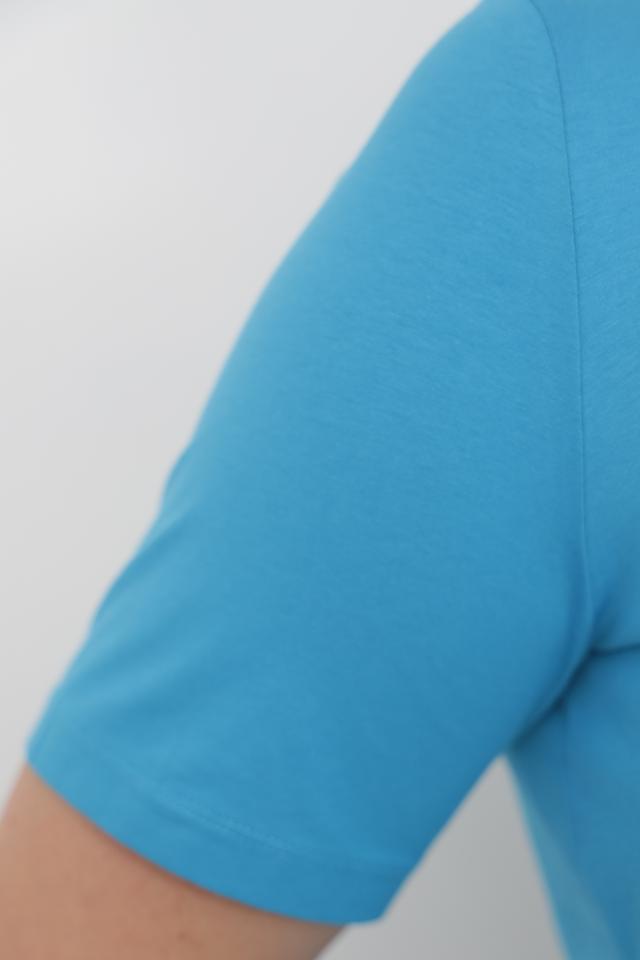 Футболка имеет прямой крой и короткие рукава. Основной цвет – яркий бирюзовый, который освежает и придает образу легкость. Передняя часть футболки украшена крупным графичным принтом в сине-голубых тонах с элементами, имитирующими мерцание и линии.