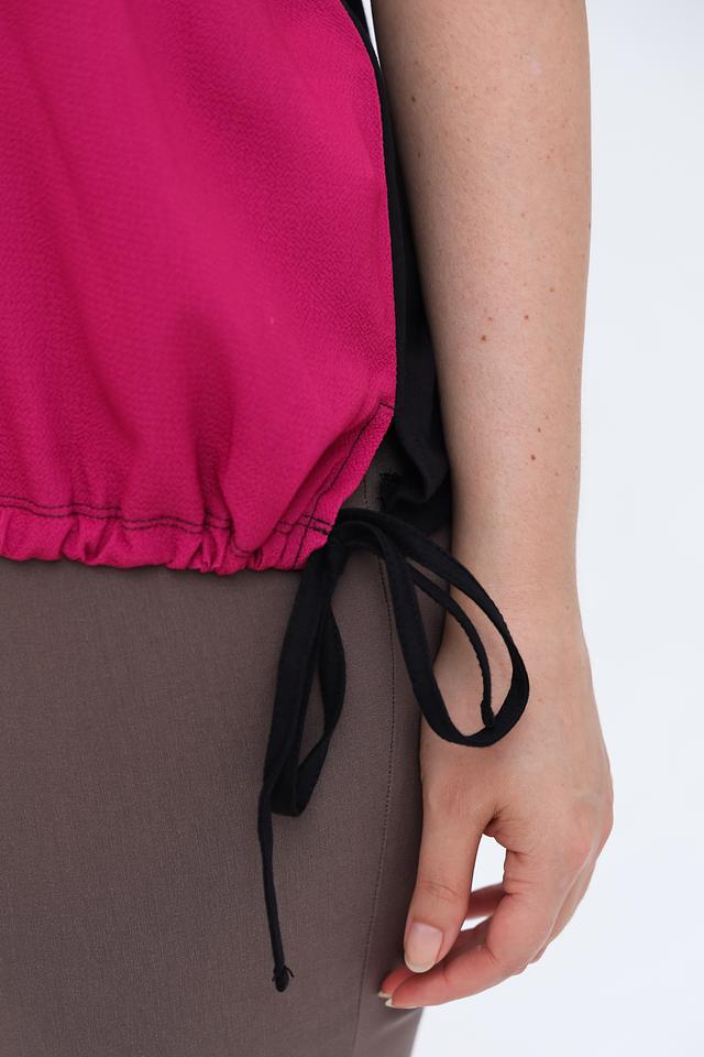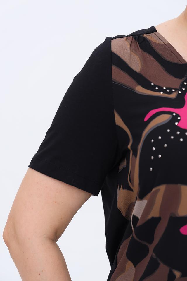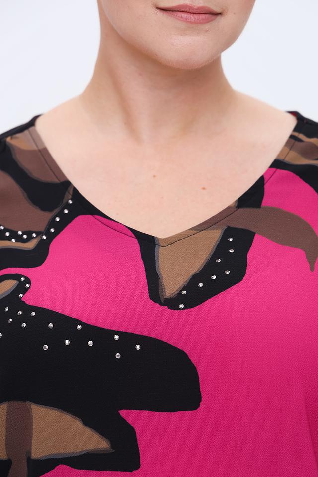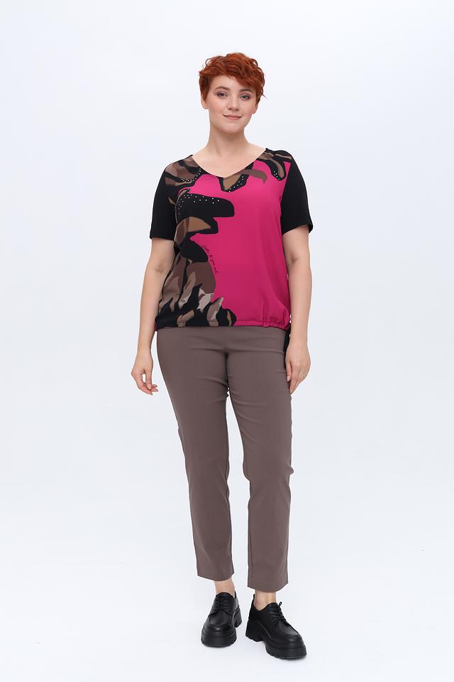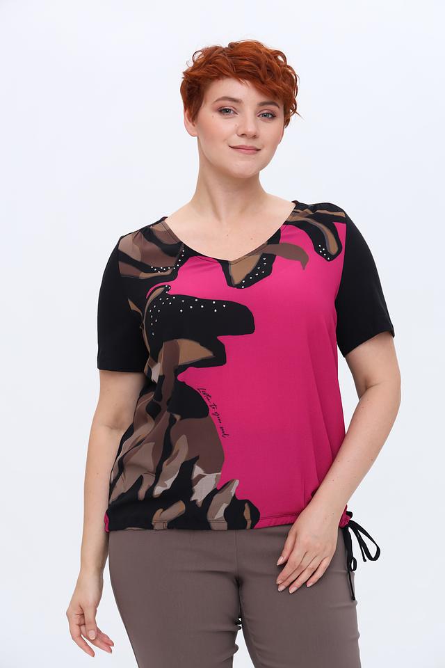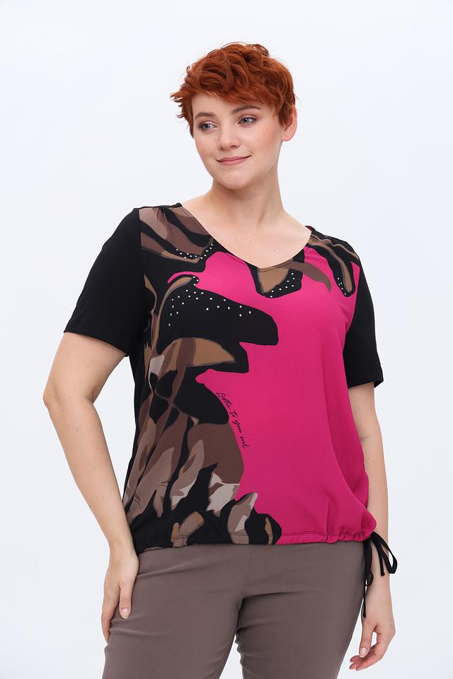 Особенностью этой модели является эффектный принт в фуксиевых, коричневых и черных тонах. Декоративные элементы в виде мелких бусин добавляют блузе изысканности. Сбоку предусмотрены шнурки для регулировки силуэта.