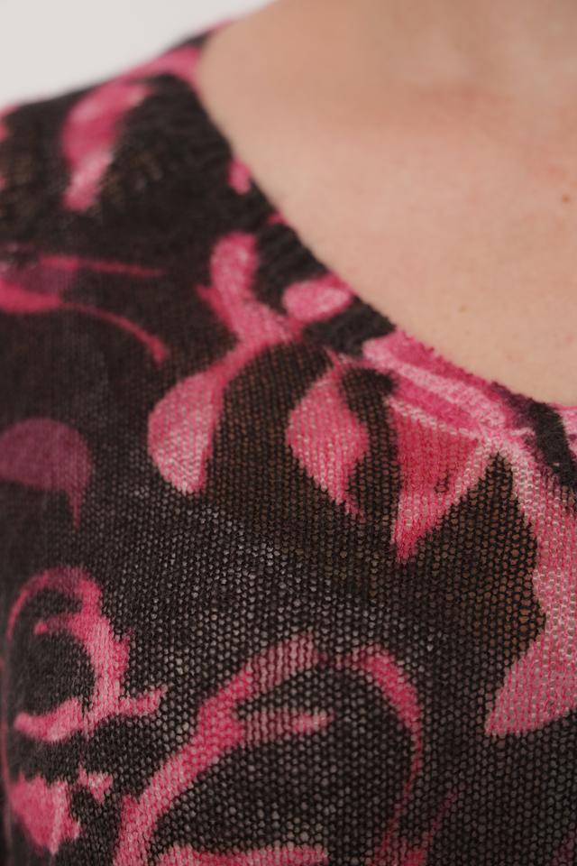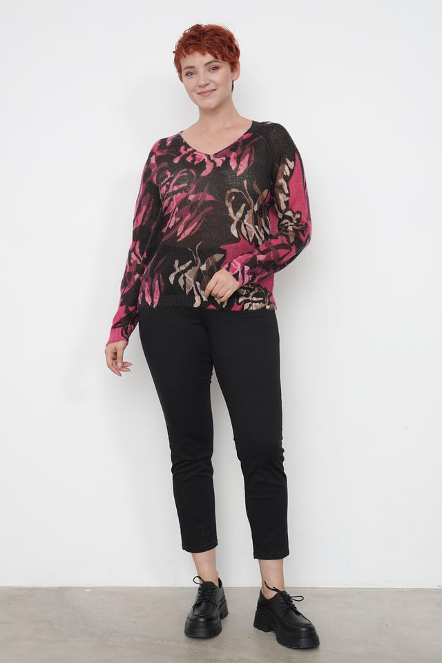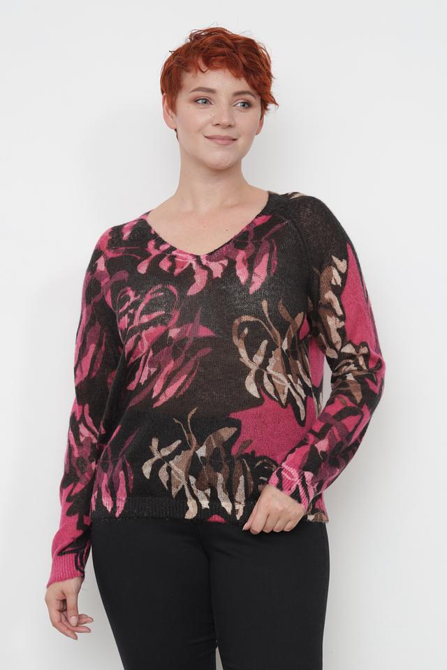 Этот женский пуловер от Samoon выполнен в ярком фуксиевом цвете и украшен эффектным цветочным принтом. Модель имеет V-образный вырез и длинные рукава, что делает ее универсальной для создания различных образов.