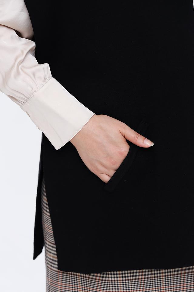 Жилет имеет прямой крой и лаконичный дизайн, что делает его универсальным и подходящим для женщин любого возраста. Отложной воротник добавляет элегантности, а отсутствие застежек обеспечивает свободу движений и комфорт в носке.