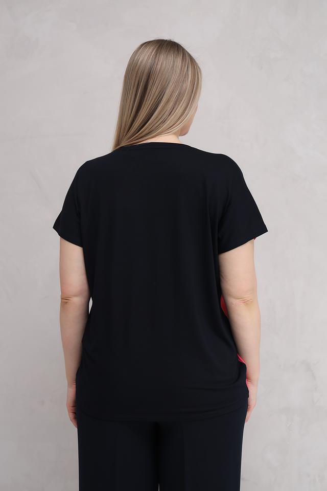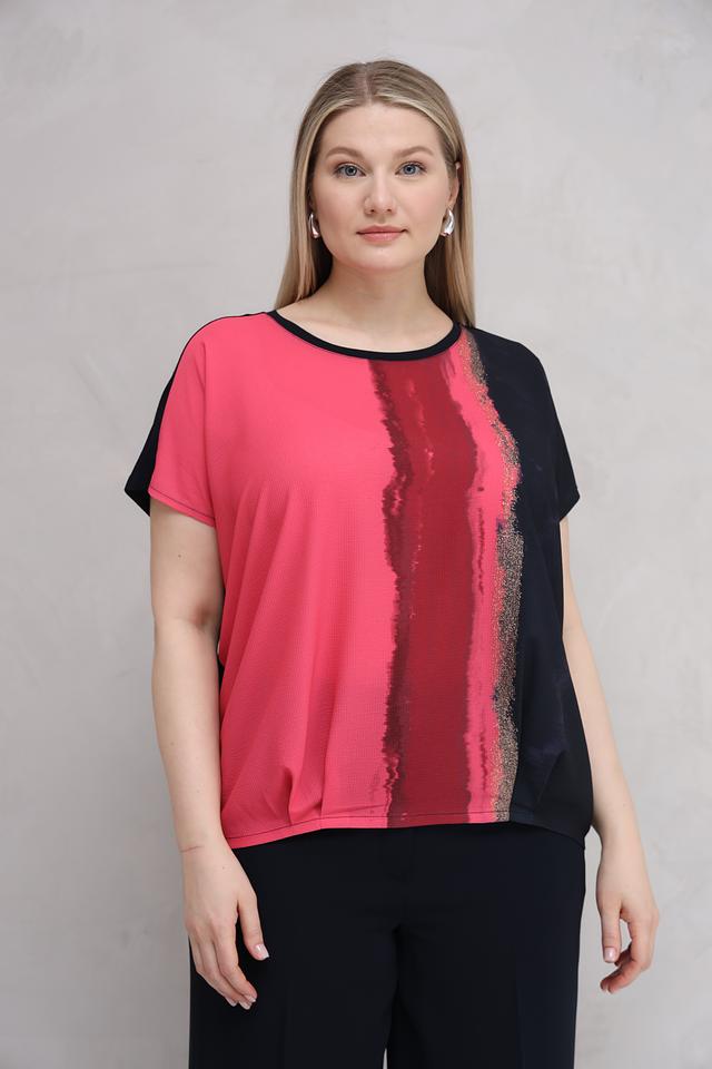 Особенностью данной модели является оригинальный принт в виде вертикальных мазков кораллового и черного цветов. Этот принт добавляет блузе изысканности и индивидуальности. Состав: 92% вискоза, 8% эластан.