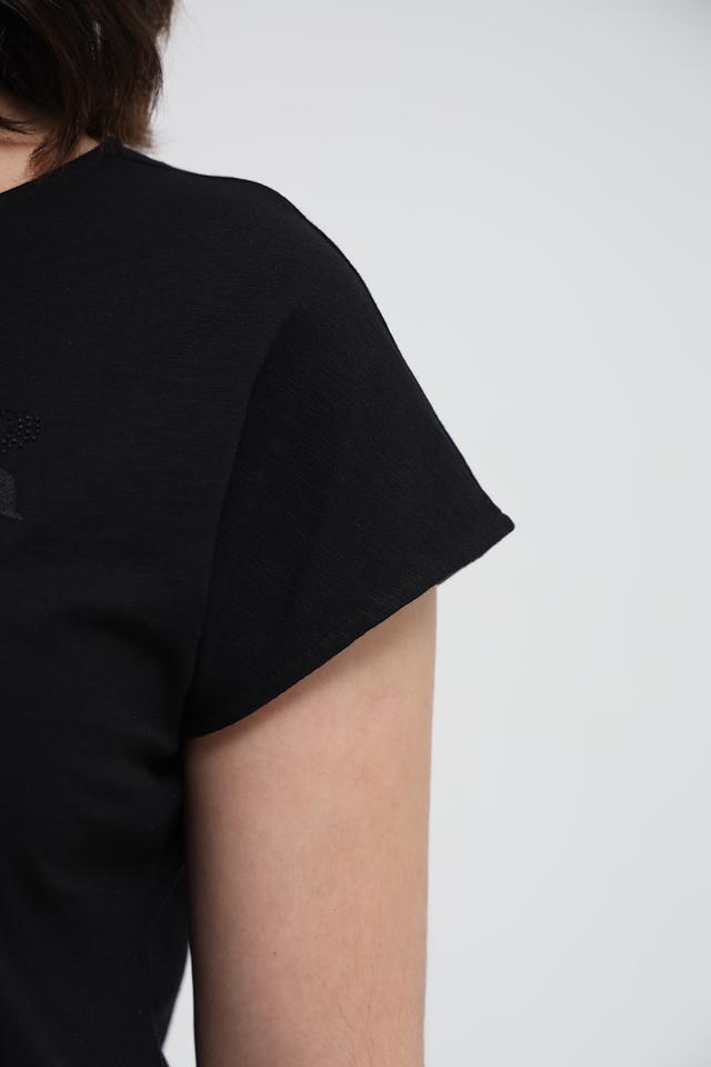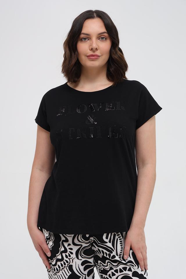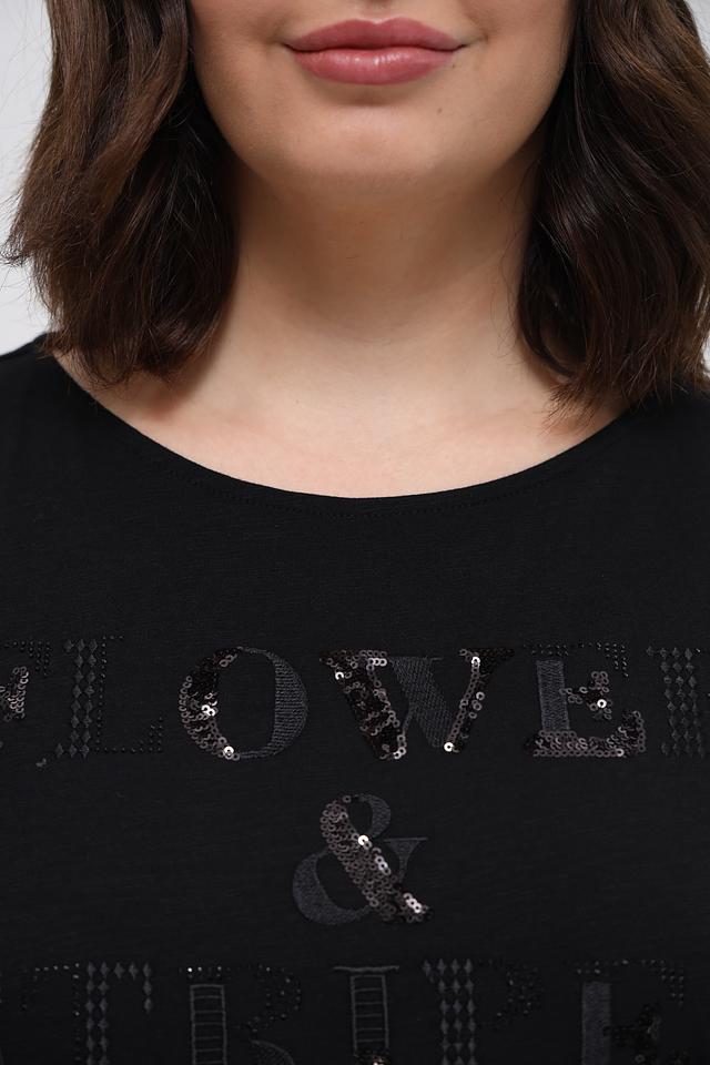 Основной цвет футболки – чёрный, что делает её универсальной и легко сочетаемой с другими элементами одежды. Передняя часть украшена эффектным декором из пайеток, образующим надпись "Flower & Truth".